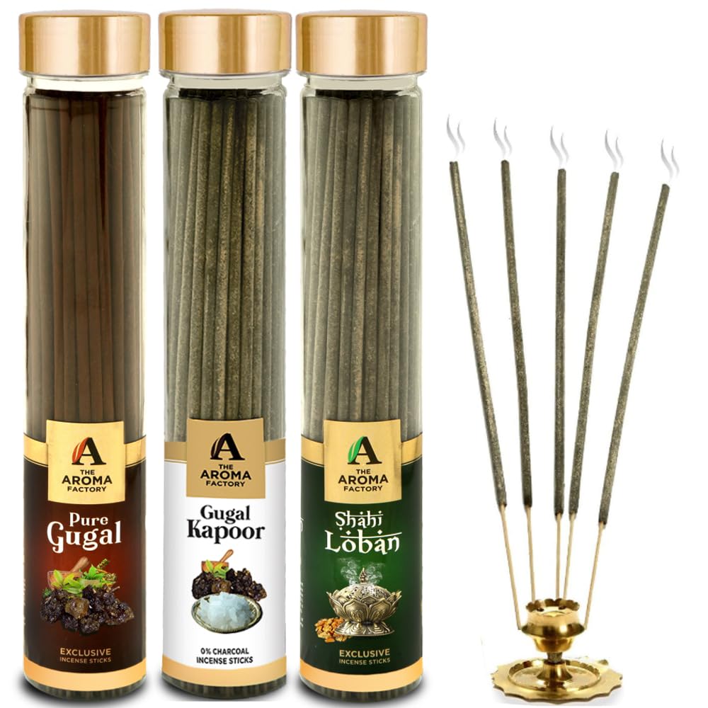The Aroma Factory Gugal Gugal Kapoor & Loban Agarbatti for PoojaLuxury Incense Sticks100% Herbal Fragrance Agarbathi 0% Surphates (Bottle Pack of 3x100g)