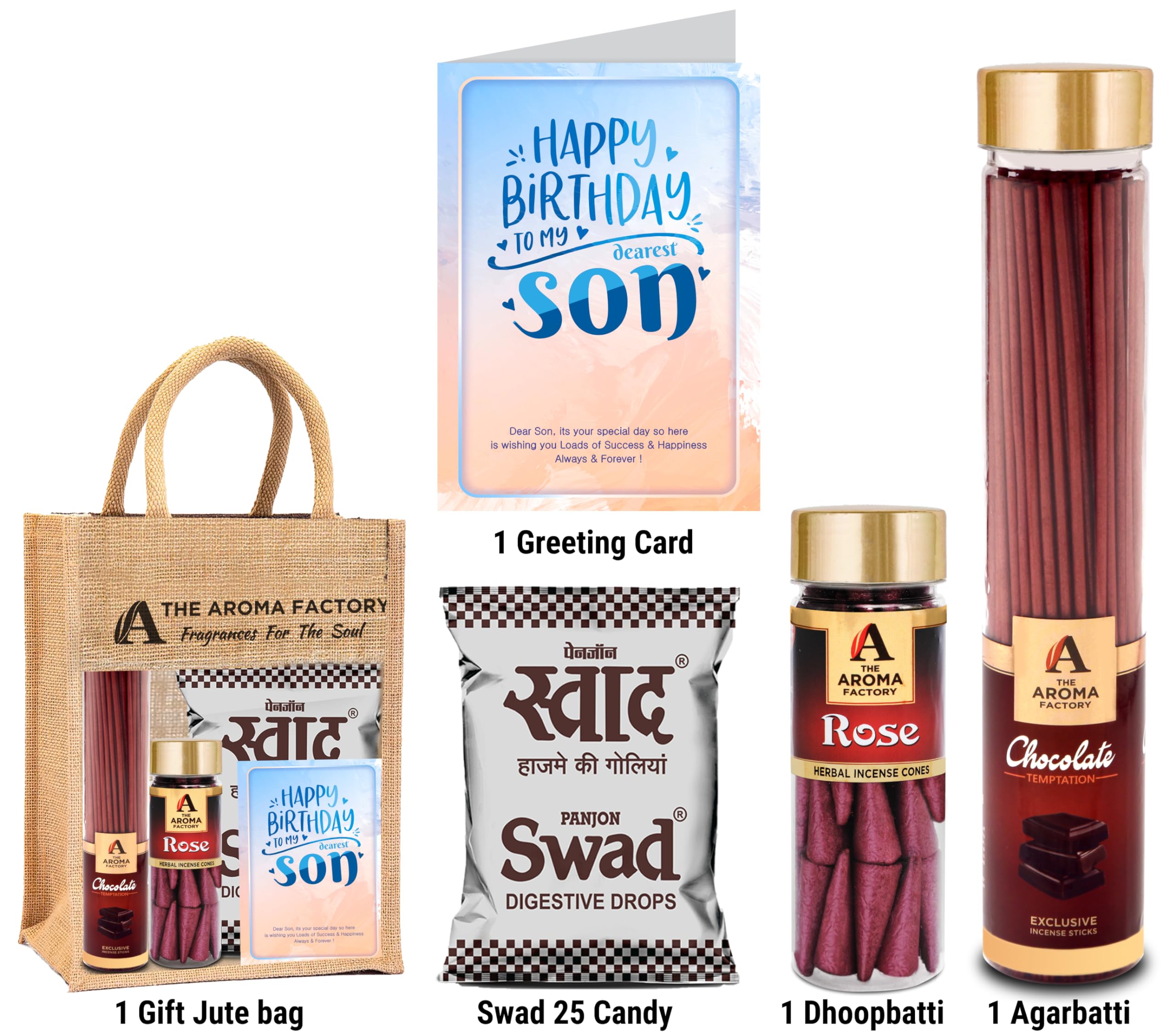 Get that perfect Aroma! The Aroma Factory Happy Birthday son beta Gift with Card (25 Swad Candy Agarbatti bottle Cone) in Jute Bag Happy Birthday Uncle Gift with Card Scent Fragrance Set Happy Birthday Uncle Gift with Card hamper gifts best unique for greeting message customised customized personalised personalized candy toffee fragrance scent perfumeIncense products improve the fragrance at homes offices spa yoga and meditation centers. The Aroma Factory agarbatti & incense products are 100% charcoal free bringing you all the aroma benefits but with no harmful chemicals.