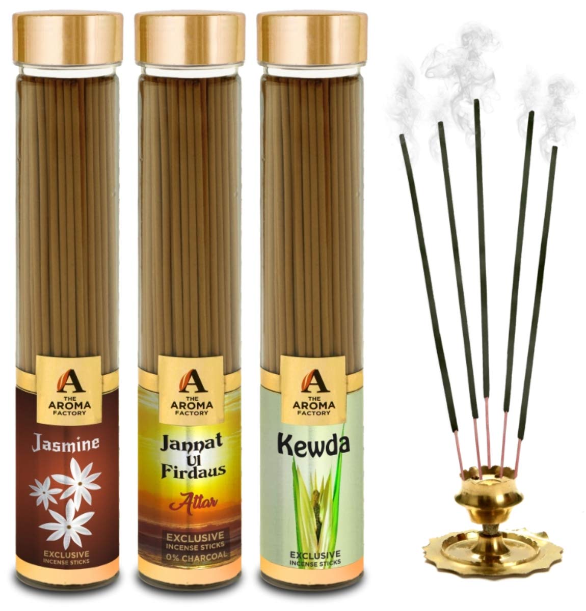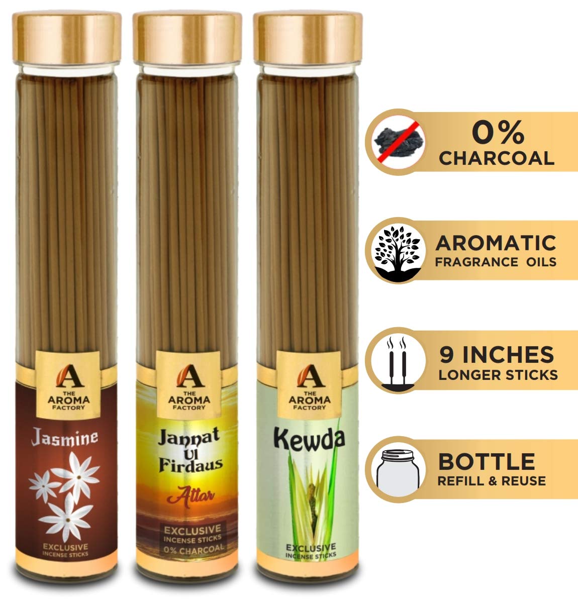 The Aroma Factory JasmineAttar Jannat & Kewda Agarbatti for PoojaLuxury Incense Sticks100% Herbal Fragrance Agarbathi 0% Surphates (Bottle Pack of 3x100g)