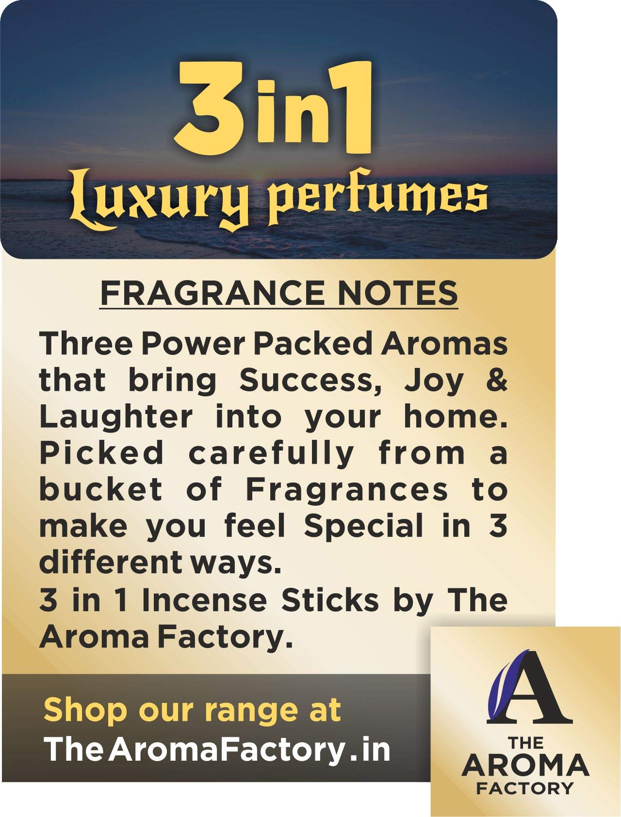 The Aroma Factory Kesar Chandan 3 in 1 Patchouli Fresh Active & White Sage Incense Stick Agarbatti (Zero Charcoal & 100% Herbal) Bottle Pack of 5 x 100. Experience the Soothing Scent of Exclusive Incense Sticks Agarbatti by The Aroma Factory - A Quality product by Panjon Limited. Fragrances specially curated to Rejuvenate your Senses and Calm your Soul. Made with Natural Essential Oils and 0 percent Charcoal Content indulge in the Soothing Aroma of Incense Sticks by The Aroma Factory. Try all fragrances of Agarbatti and Dhoop Batti by The Aroma Factory : Chandan Loban Gugal Mogra Rose Lavender White Sage Sandalwood Attar Jannat Ul Firdaus Citronella Patchoulli Chocolate Green Apple Strawberry Pineapple Jasmine.Incense Sticks Agarbatti sandalwood agarbathi agarbati dhoop dhoopbatti dhoopbati dhoop batti agarbathies incensestick incensesticks incense aroma meditation pooja puja charcoalfree. Suitable for gifting : Add more aroma to your loved oneâs life by getting them these fragrance sticks on occasions such as Diwali Rakhi and other festive events. 100% Quality Assured.