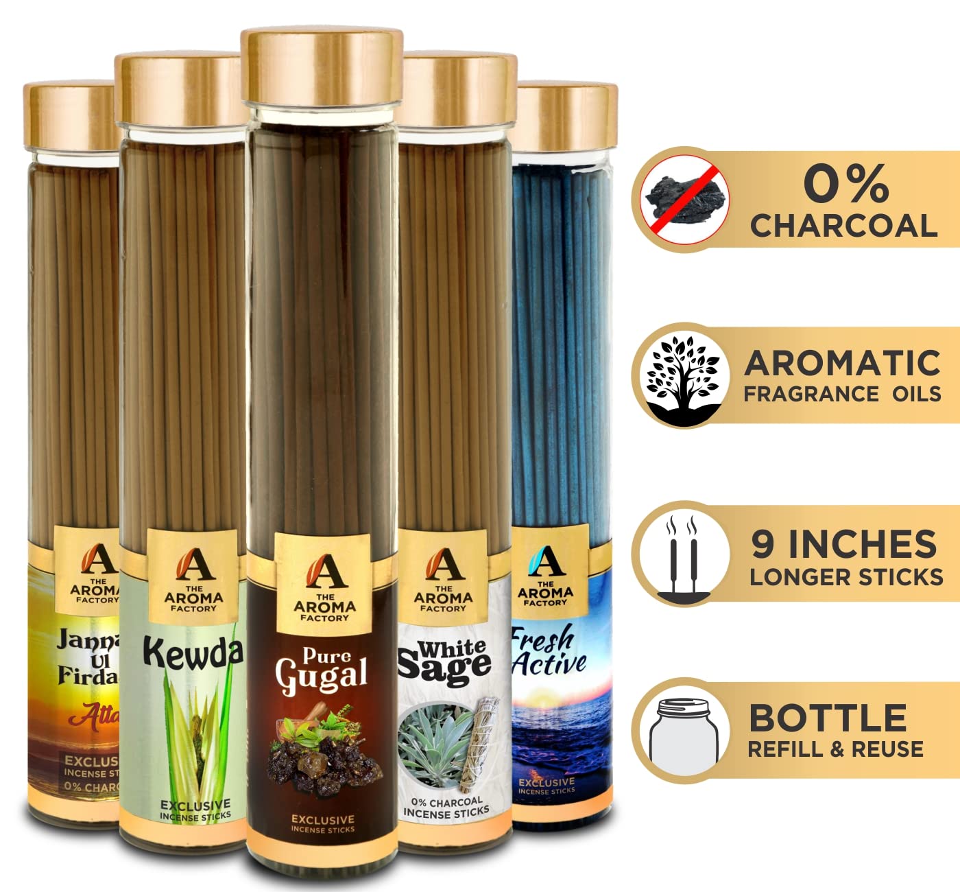 The Aroma Factory Organic GugalWhite SageKewdaAttar Janant & Fresh Active Agarbatti for Pooja No Charcoal Incense Sticks (Bottle Pack of 5 x100g)