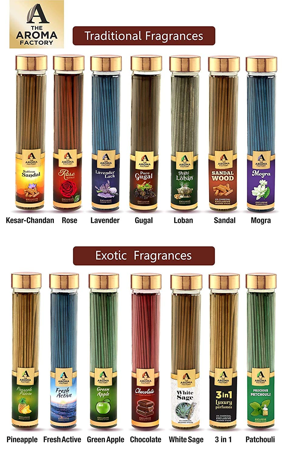 The Aroma Factory Patchouli & Sandalwood Chandan Incense Sticks Agarbatti (Charcoal Free & Low Smoke) Bottle Pack of 2 x 100 with an invigorating and refreshing fragrance.