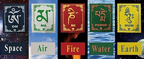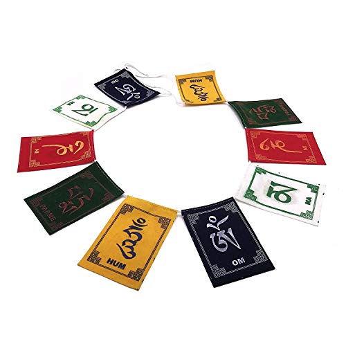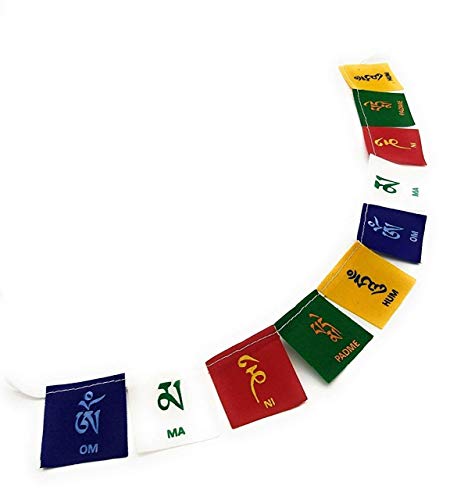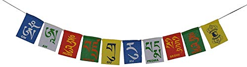 This Tibetan Buddhist Prayer Flag is inscribed with auspicious symbols invocations prayers and mantras. Tibetan flags are placed outside homes and places of spiritual practice for the wind to carry the vibrations of the mantra across. The 5 colors of prayer flags represent the 5 basic elements like earth water fire air and space. Prayer flags moving in the wind generate a natural positive energy. It can be placed both indoors or outdoors of your house in office. This size is medium and is suitable for Car Bikes and Home door.