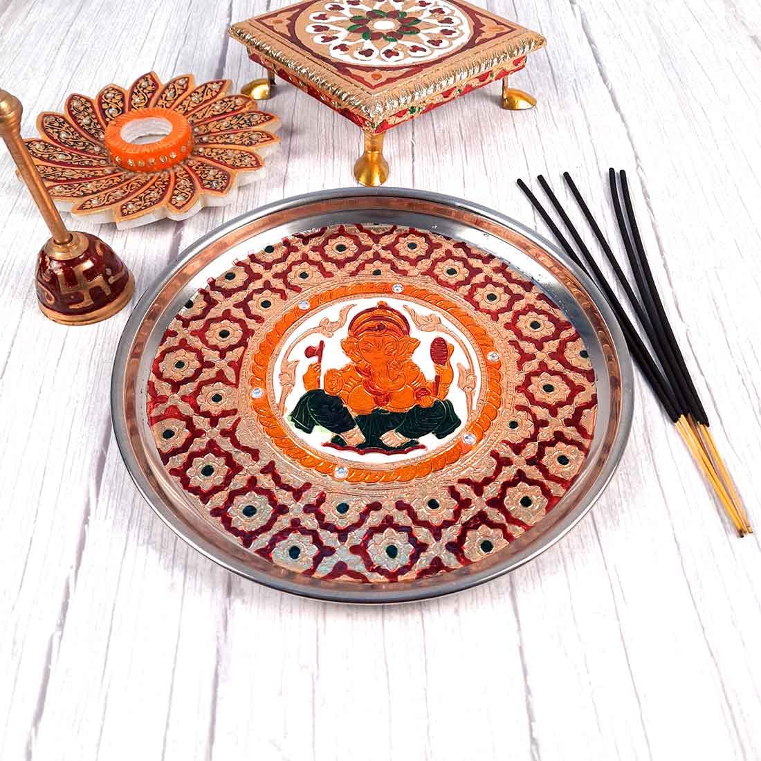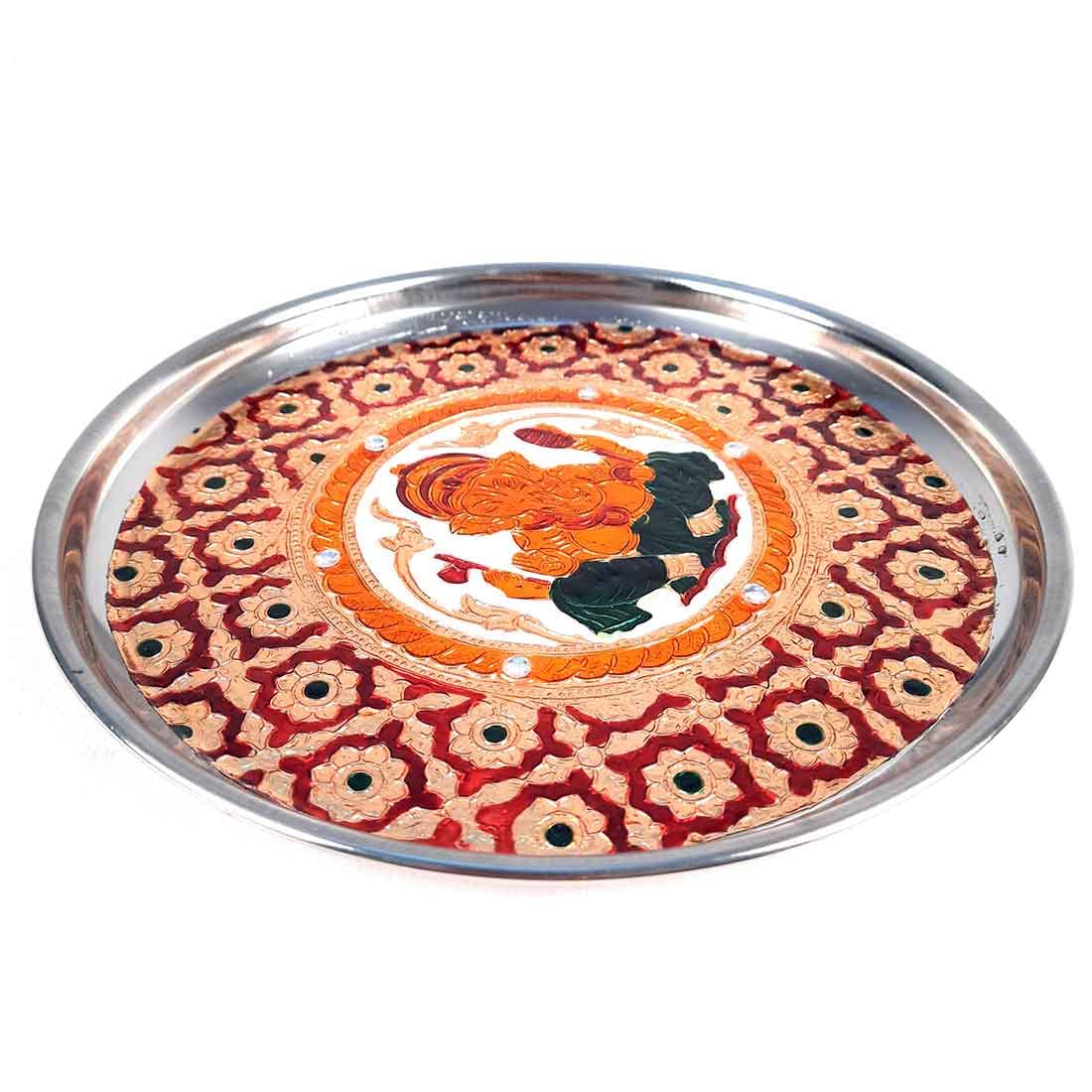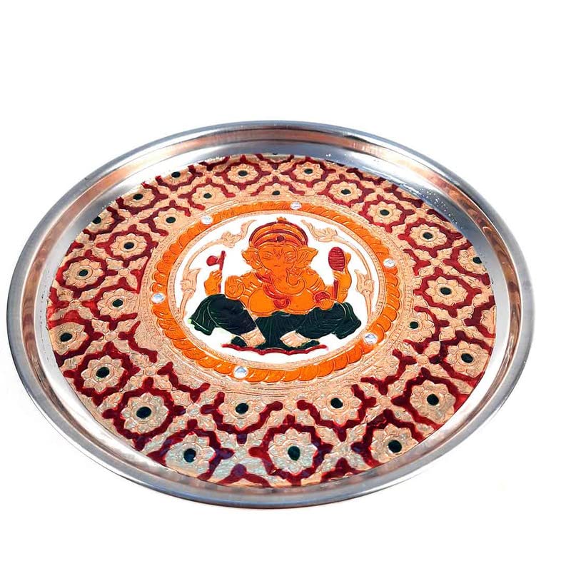 Offer prayers to the deities with these beautifully designed Puja Thali made of the steel which will add elegance and charm to your puja room. In this puja thali you can very easily arrange diya nariyal puja flowers haldi kumkum akshata rakhi etc. Perfect for worship places as well as special occasions/ festivities. Add an element of spirituality to your home decor. Perfect Addition To Your Pooja Room and a perfect gift for all the occasions. This steel pooja thali looks very beautiful and useful for the purpose of worship and for home decoration. It's designed to look traditional and stylish and inspired from the days of the royal touch. Easy to clean & maintain. One of the good surprise option for any occasion like wedding return presents corporate kitty party housewarming party ideal gift for diwali and other festivals like rakhi ganesh chaturthi navratri karwa chauth makar sankranti pongal anniversary puja etc. Very economical yet elegant choice. Also use as a best wedding & occasinal return gifts.