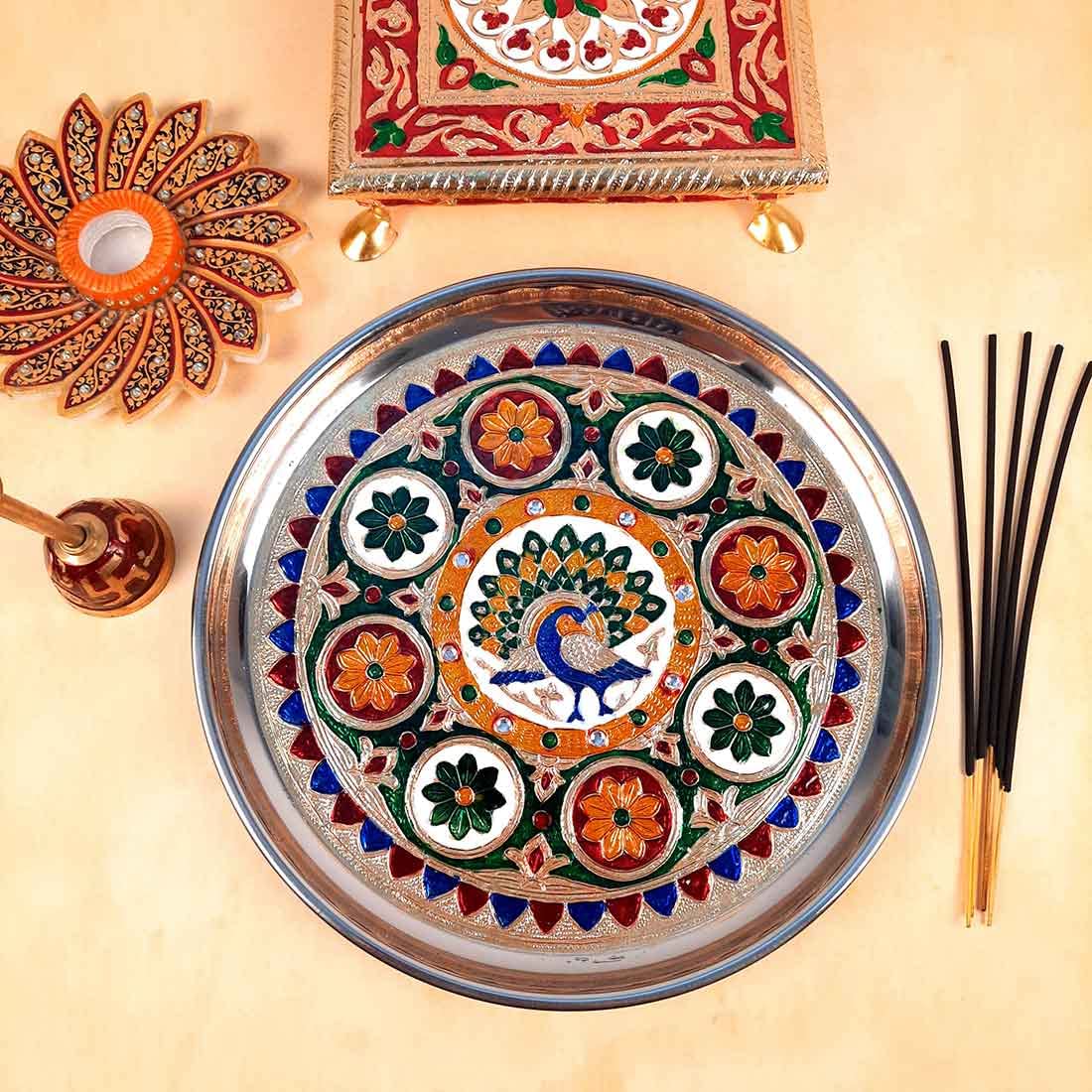 MEENAKARI ENAMEL PRODUCTS Pooja Thali Peacock & Flower Design for (Green|11 Inch) Welcome Plate/Home/Pooja/Wedding/Festival Pooja Thali