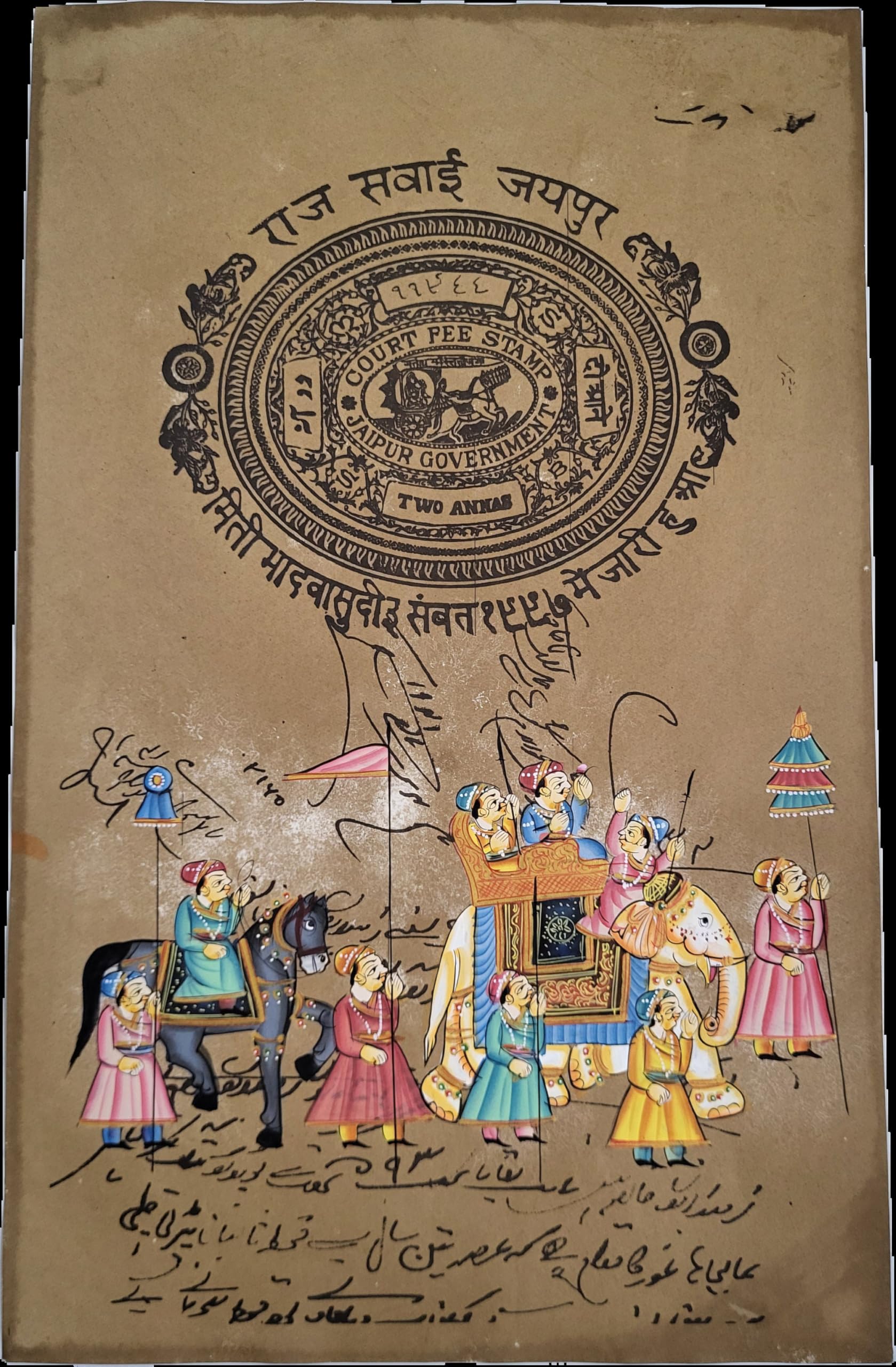 HomeHomeWall AccentsPaintingsIndian miniature painting of royal elephants and horse on vintage stamp paper for Wall Decor | Vintage Wall Art Painting (Unframed)