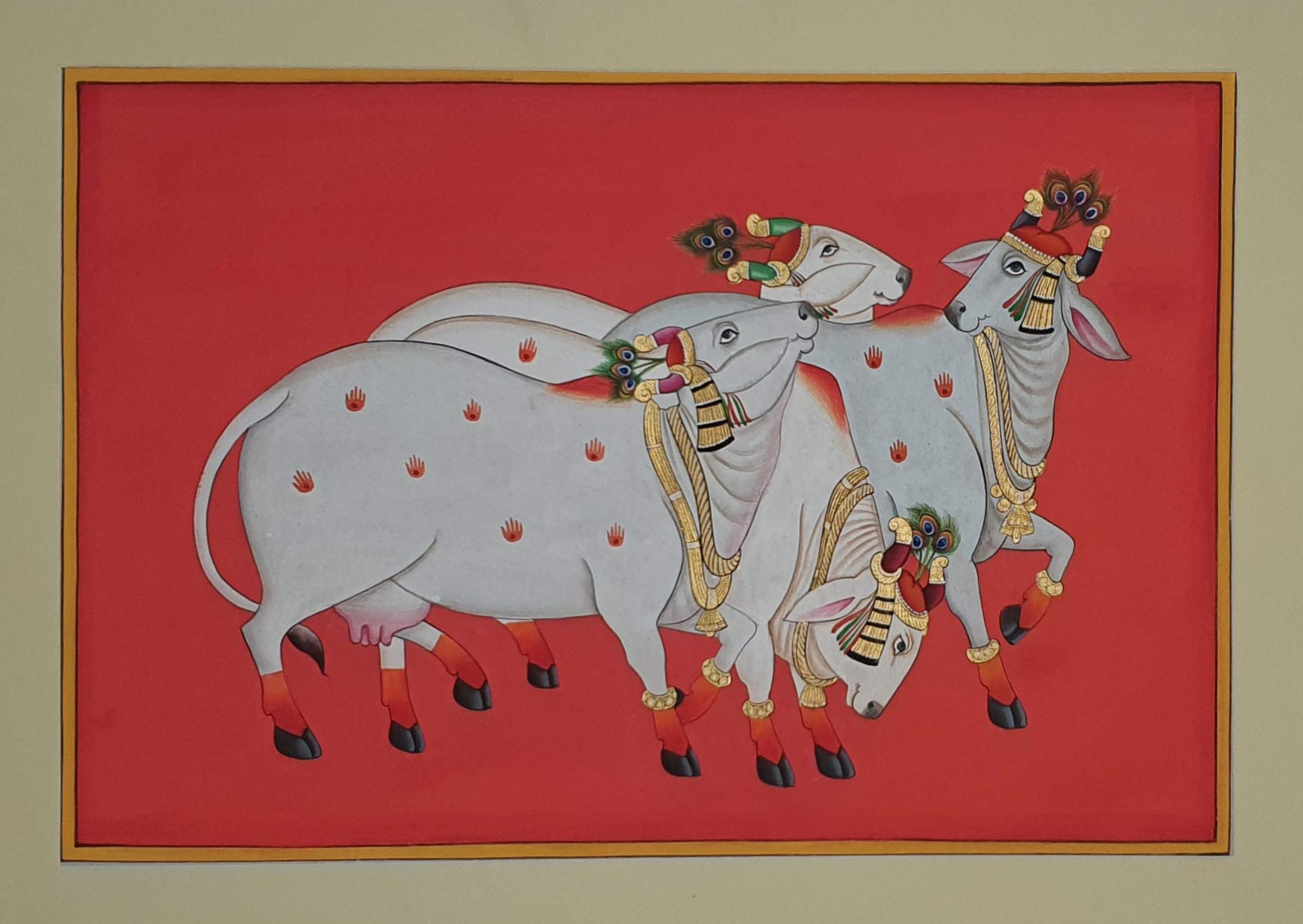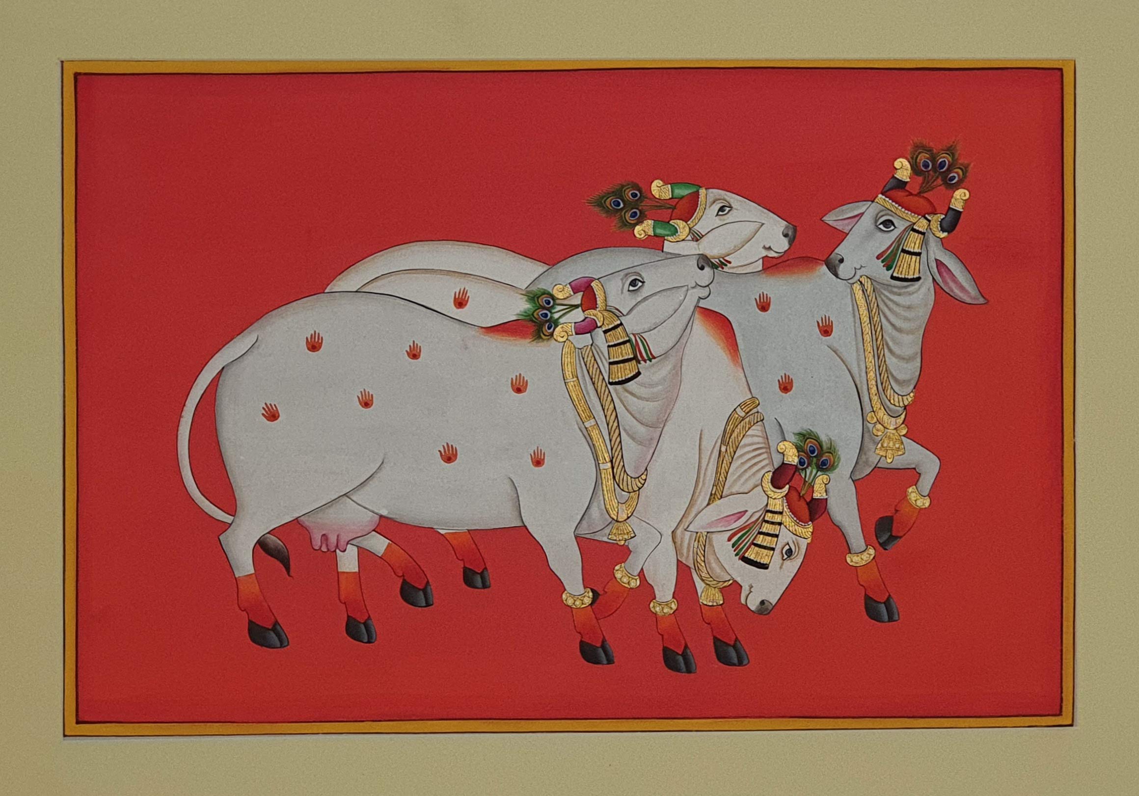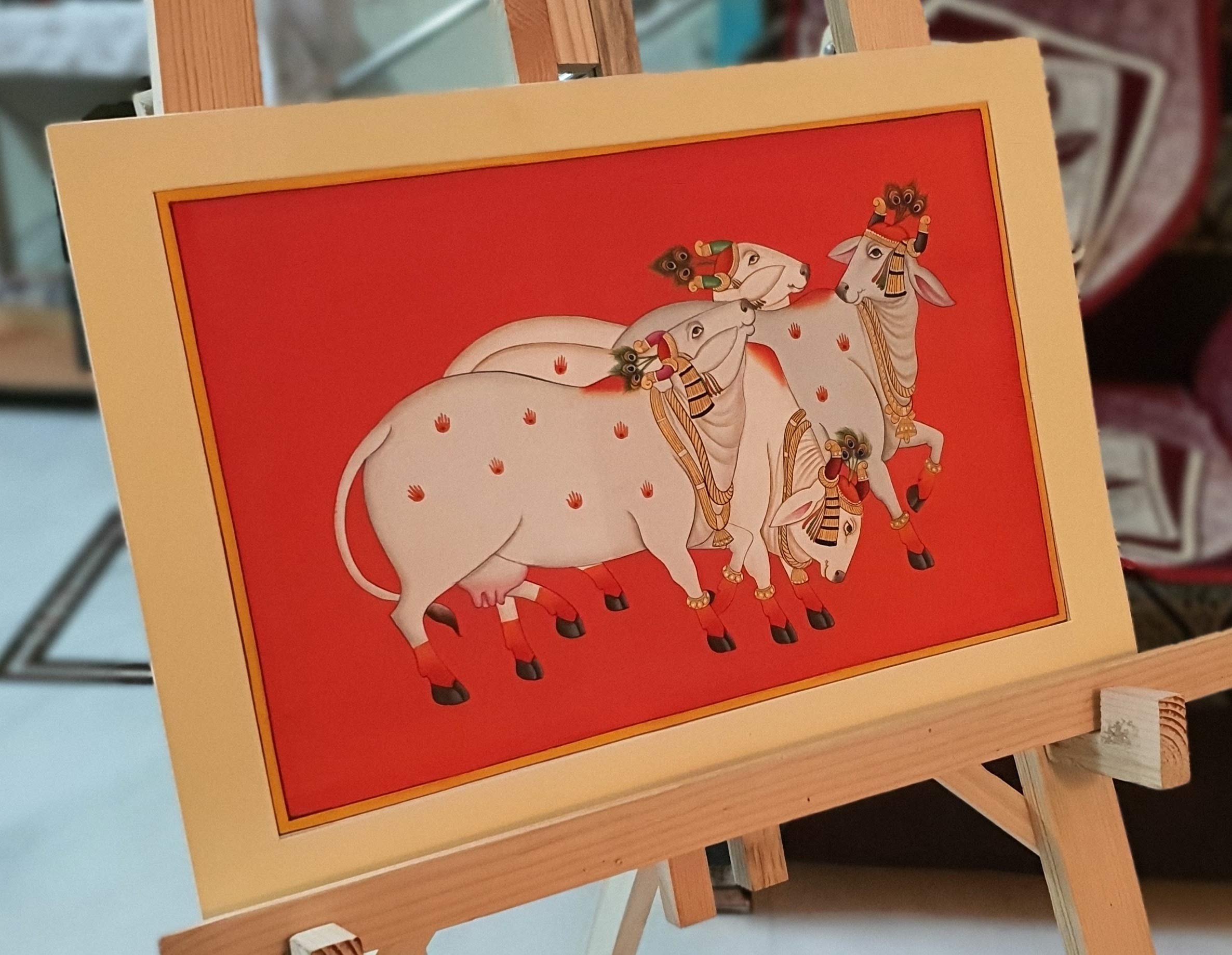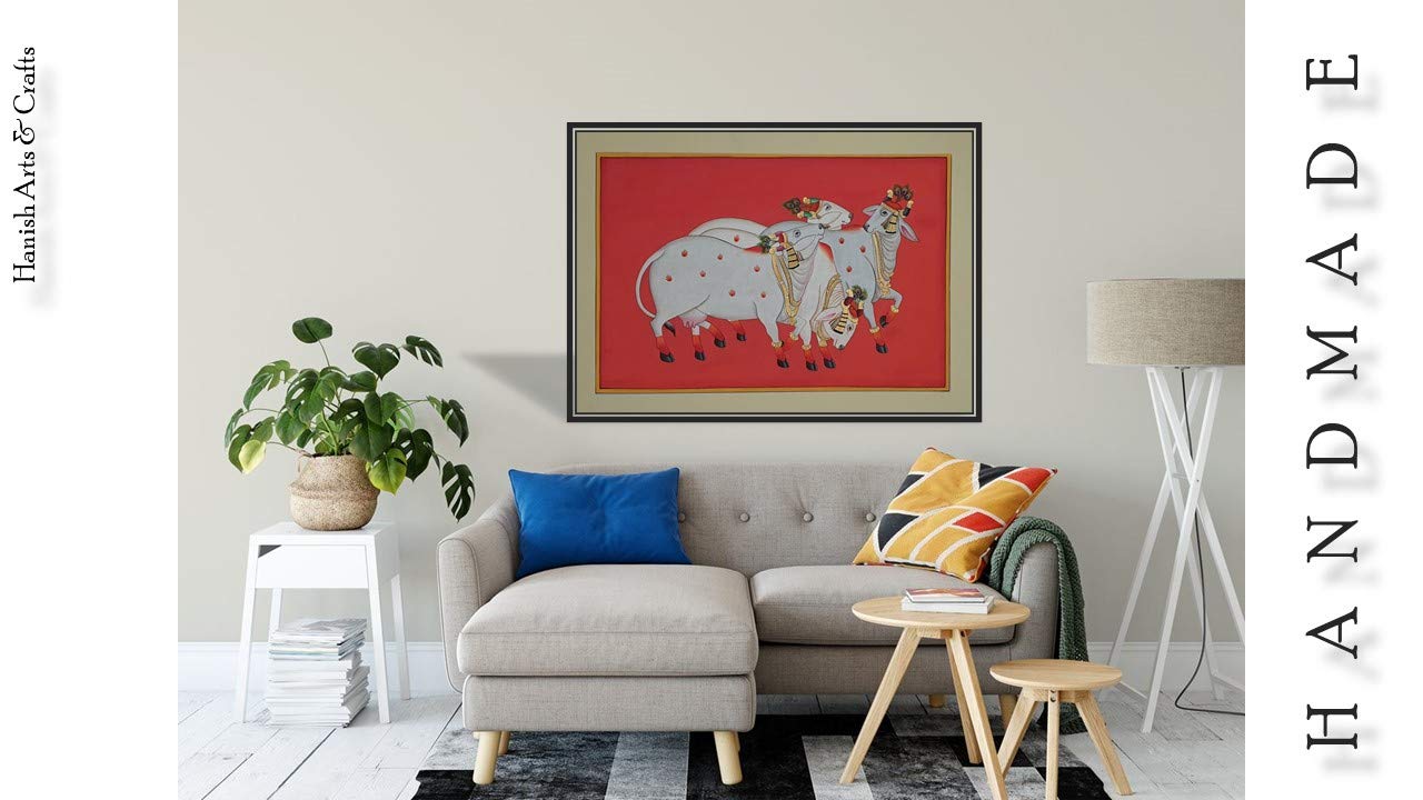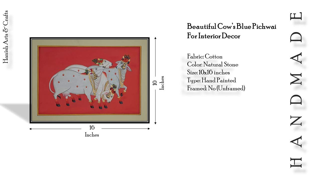PICHWAI- PAINTED TEMPLE HANGING - Cow's hand painted pichwai Painting. Overview a beautiful painting involves the action or skill of using paint in the right manner; hence the end product will be a picture that can speak a thousand words they say. Arts have been in trend for quite some time now. It can give different viewer different meanings style and design the saf wood matte abstract painting with frame is quite abstract and mysteriously beautiful. The painting has a nice frame to it. You can gift this to a family or a friend. The painting has various forms of certain figures on it as seen in the image. You can add a good set of lights to the place where the painting is and the decor will give a different feel and look to the place. Quality and durability the painting has a matte finish.