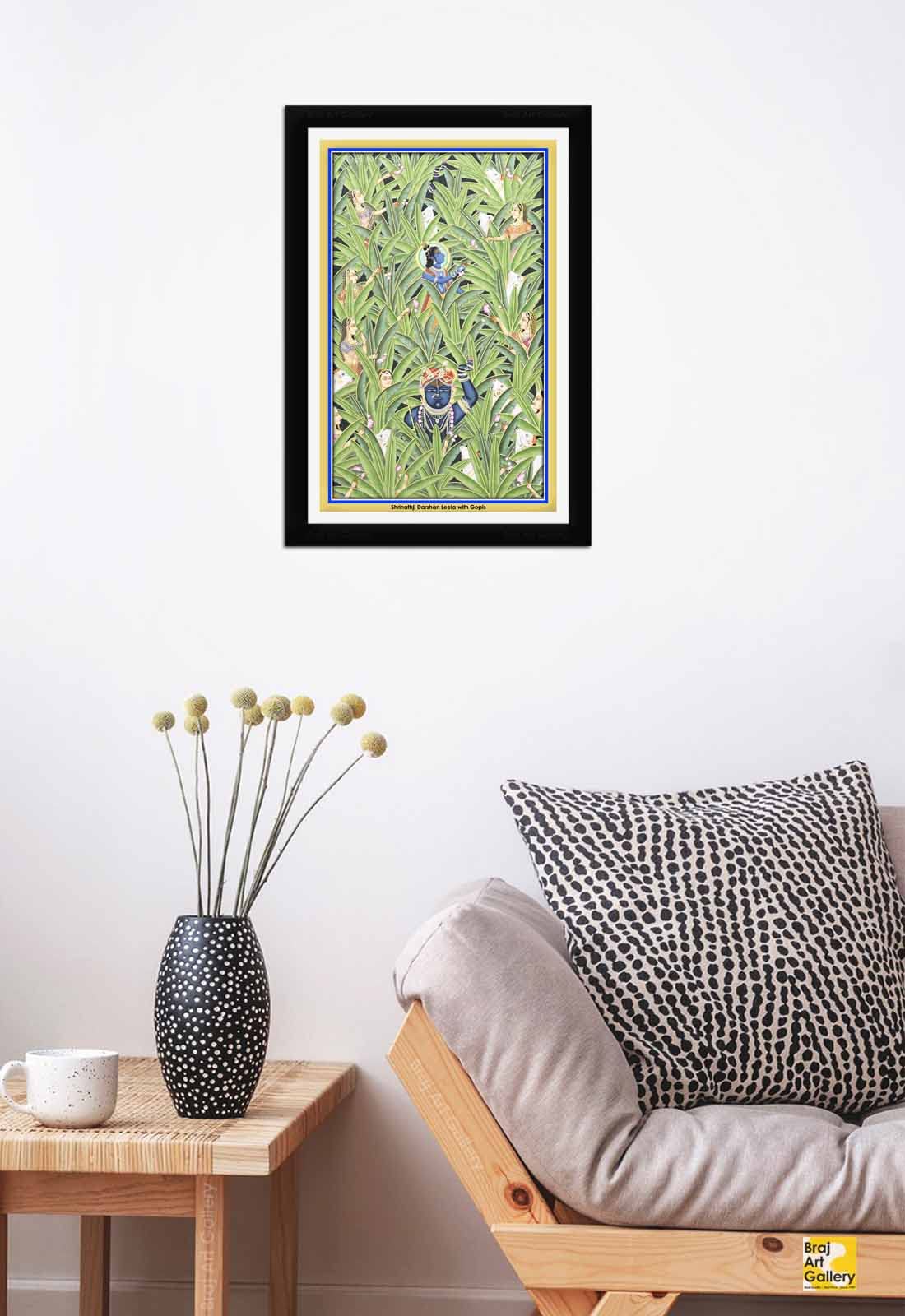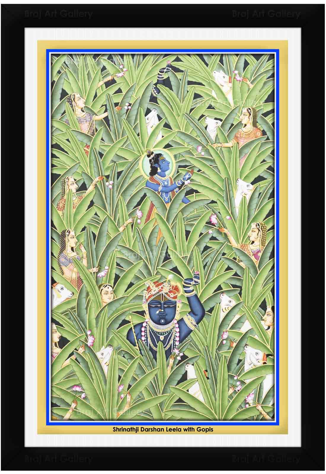 Pichwai is one of the most spectacular ancient & traditional forms of art which originated in the villages of Nathdwara in the state of Rajasthan India. This 400-year-old art form generally depicts and narrates the tales of Lord Krishna's life. The Sanskrit word "Pichh" means back and "wais" means hanging so Pichwais are paintings or hangings which form the backdrop behind the main deity of Krishna temples. The making of a traditional pichwai painting takes a considerable amount of time ranging from a couple of weeks to months.