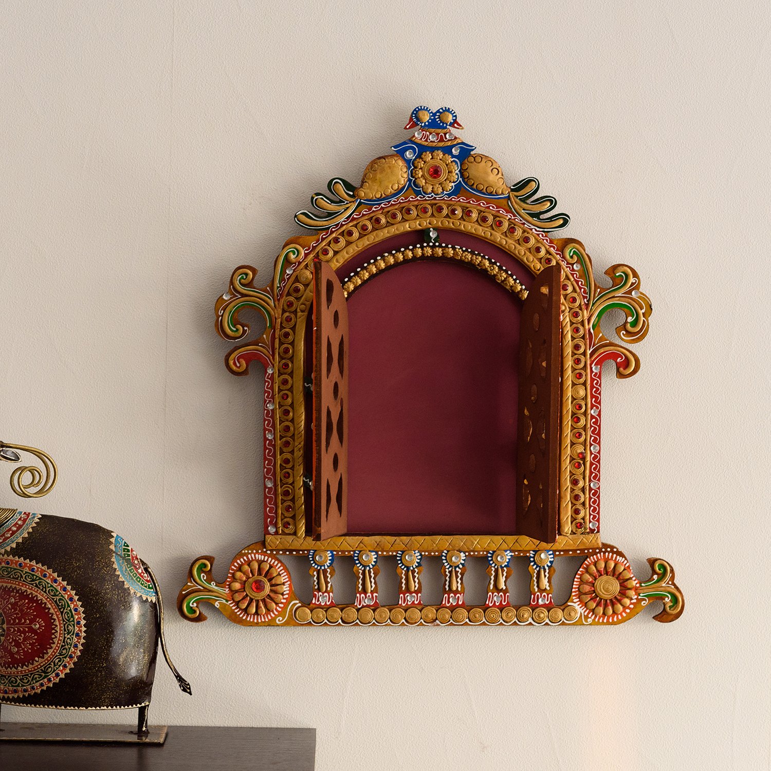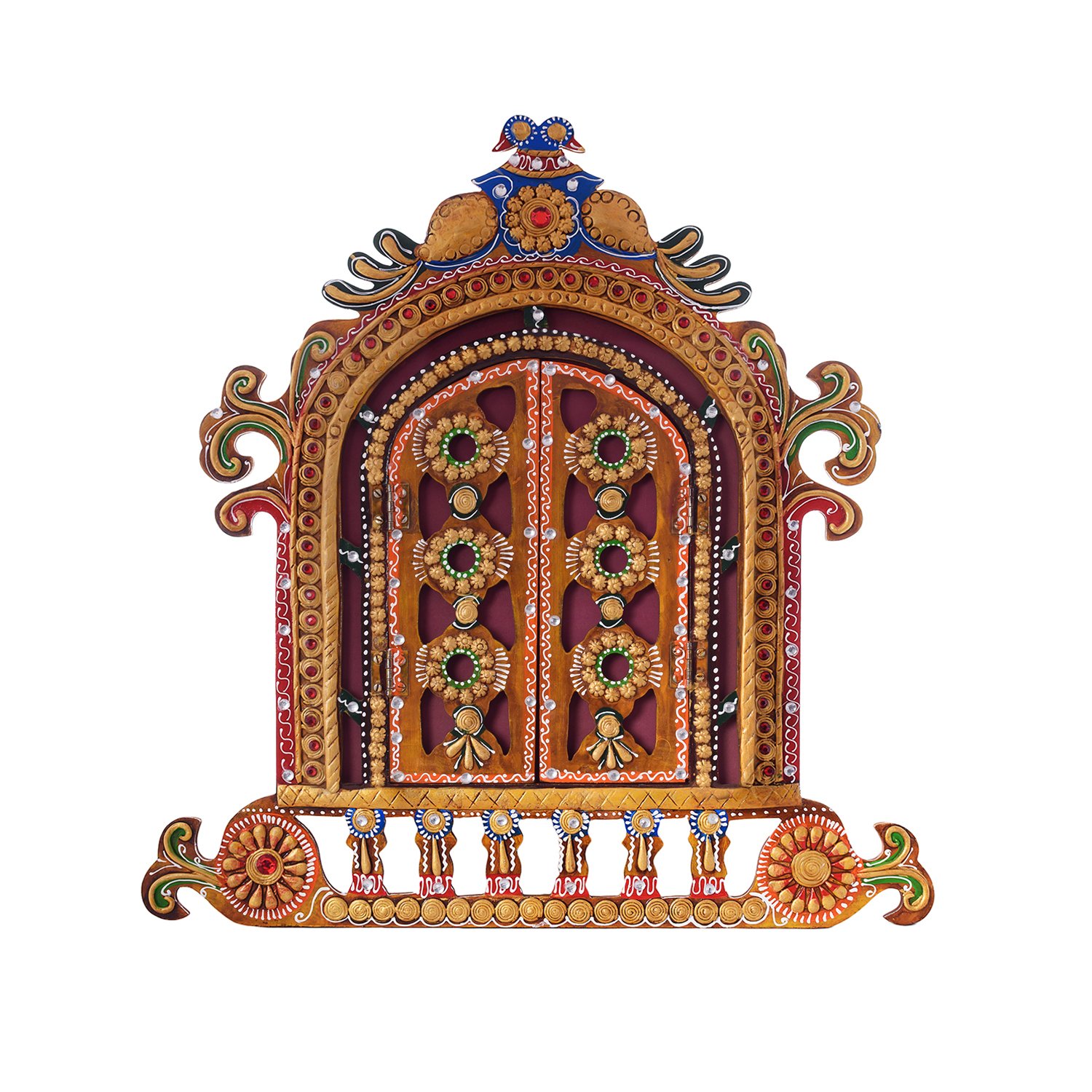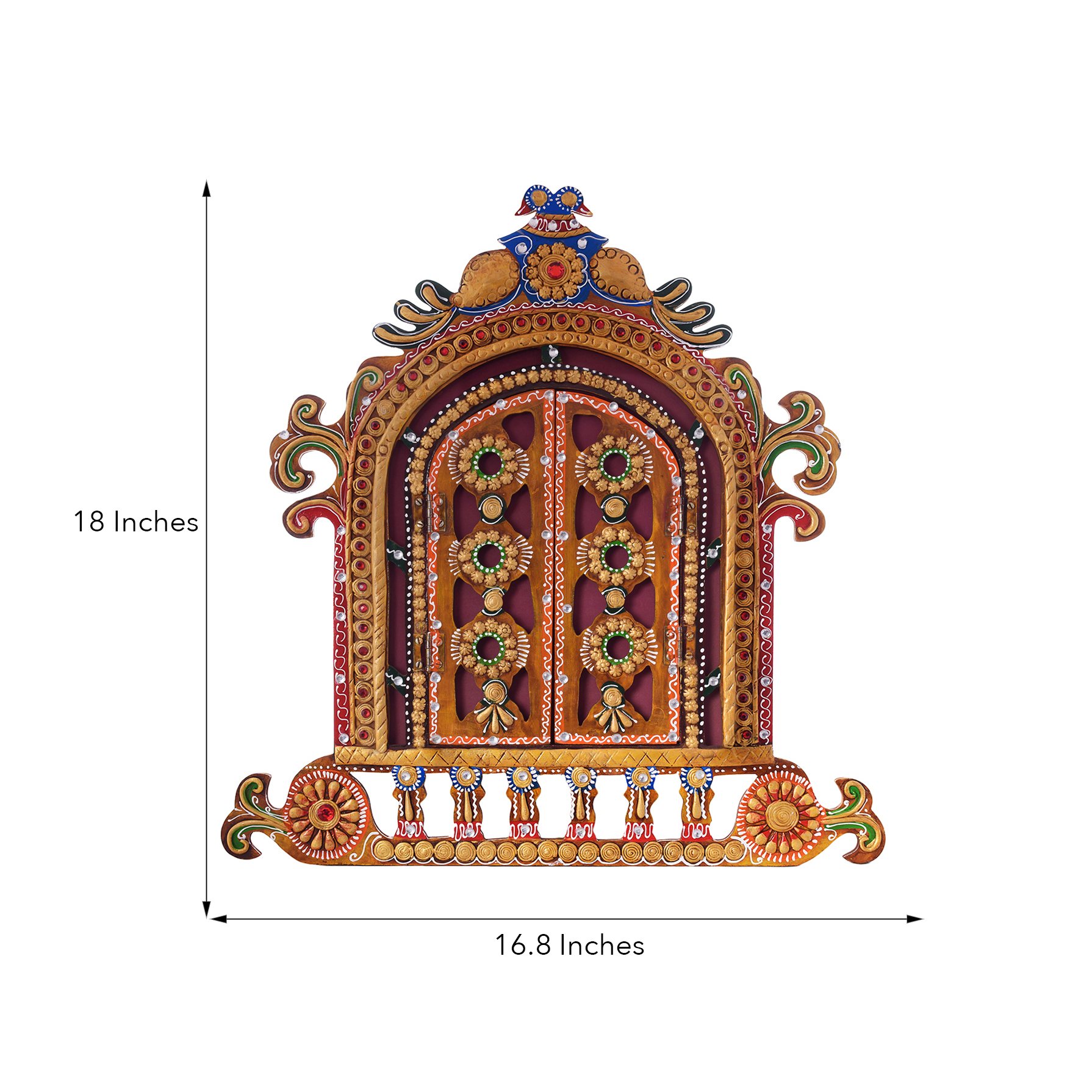 The intricate jharokha wall decor made from papier-mache and wood brings cultural charm to any space. Perfect as wooden wall hanging decor it complements wall hangings for living room bedroom. Ideal for Diwali decoration items for home decor itâ€s a lasti