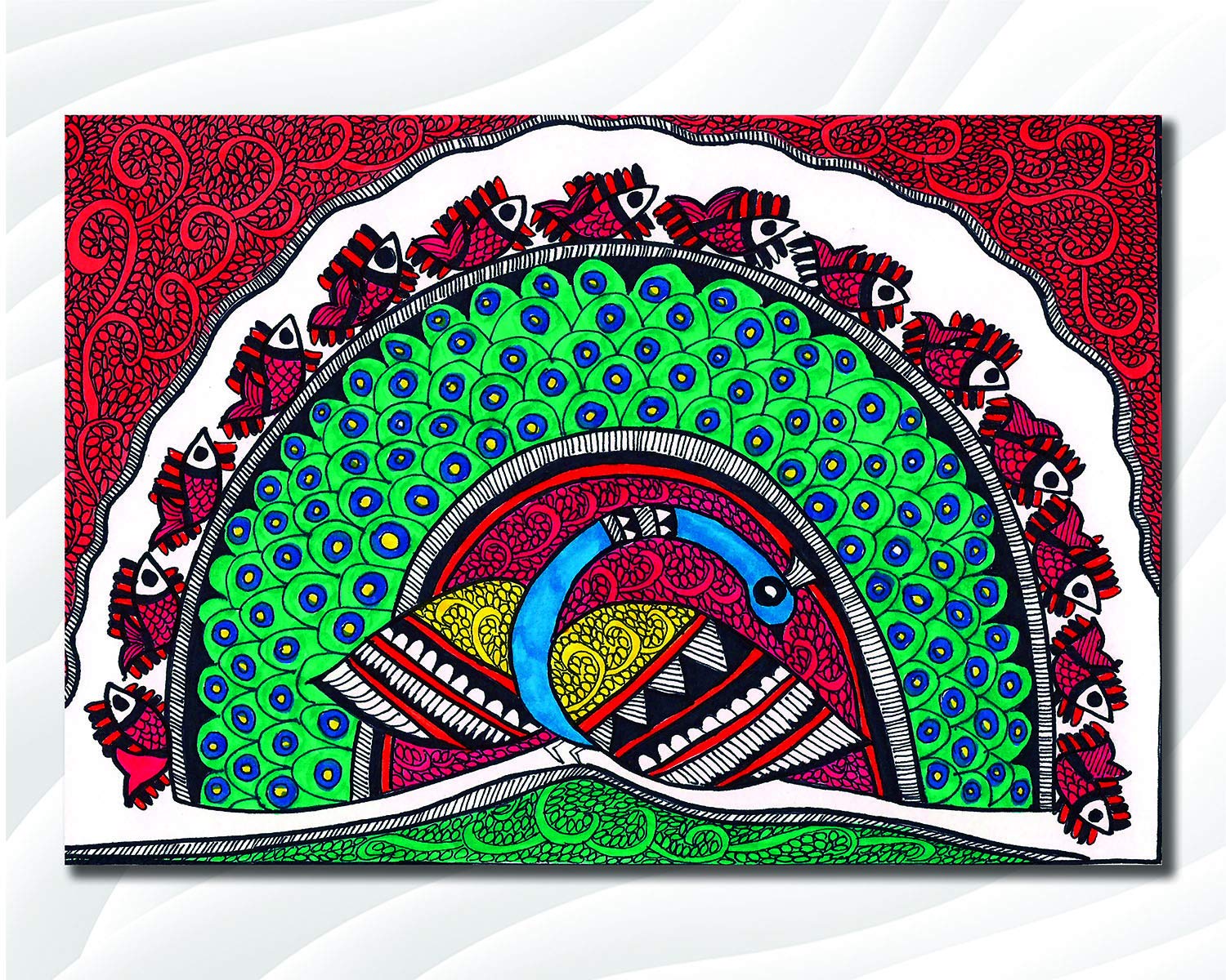 MADHUBANI PAINTINGS - Laminated Paper Poster - Colorful Peacock - Madhubani Art - Laminated Paper Poster- Laminated Paper Poster (Laminated Paper Large Size 23X35 InchesMultiColor)