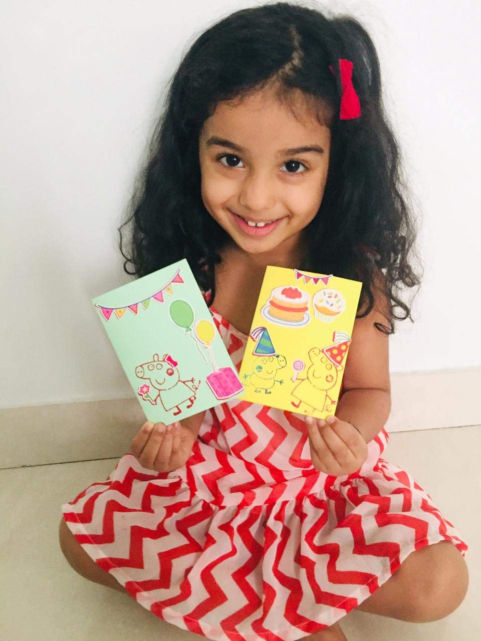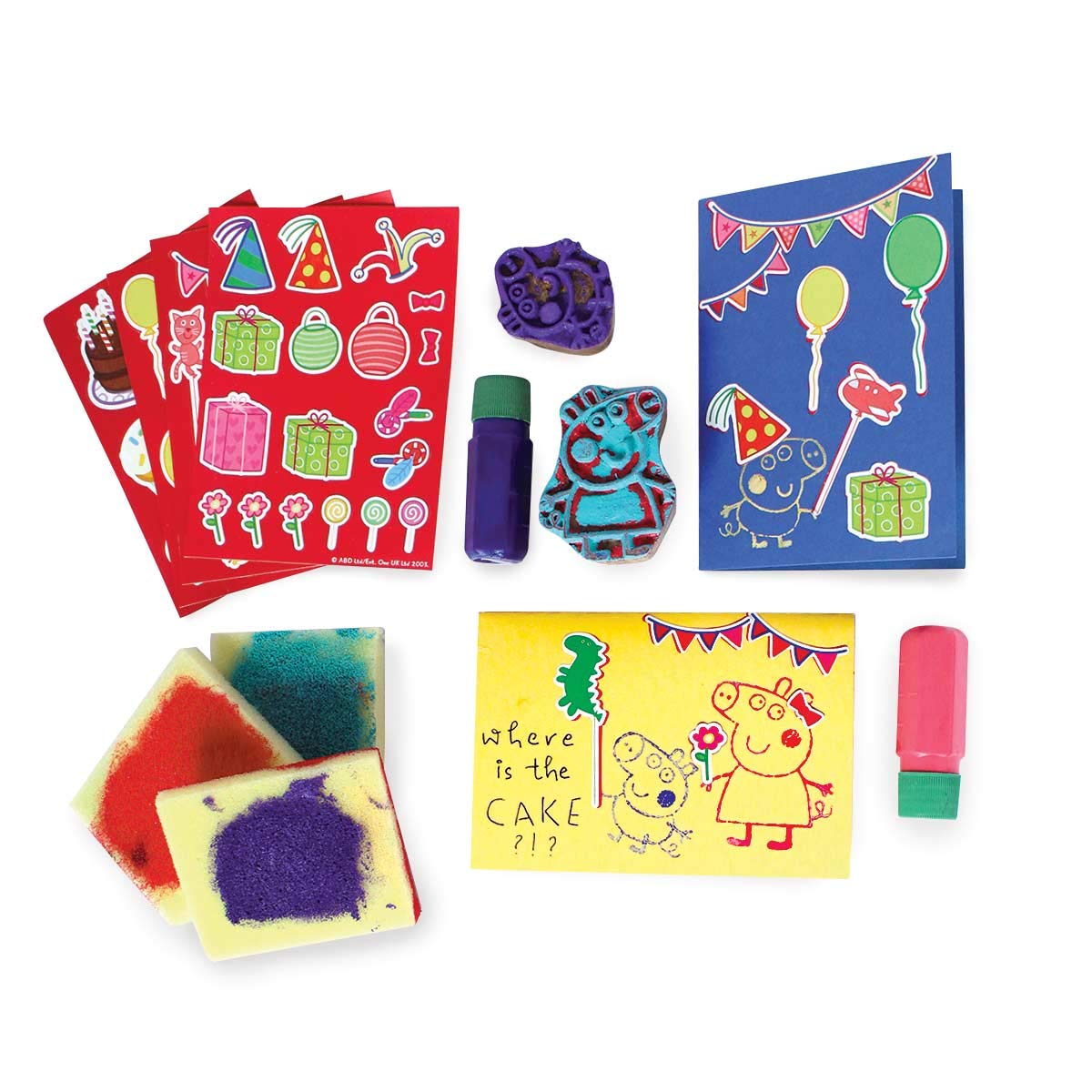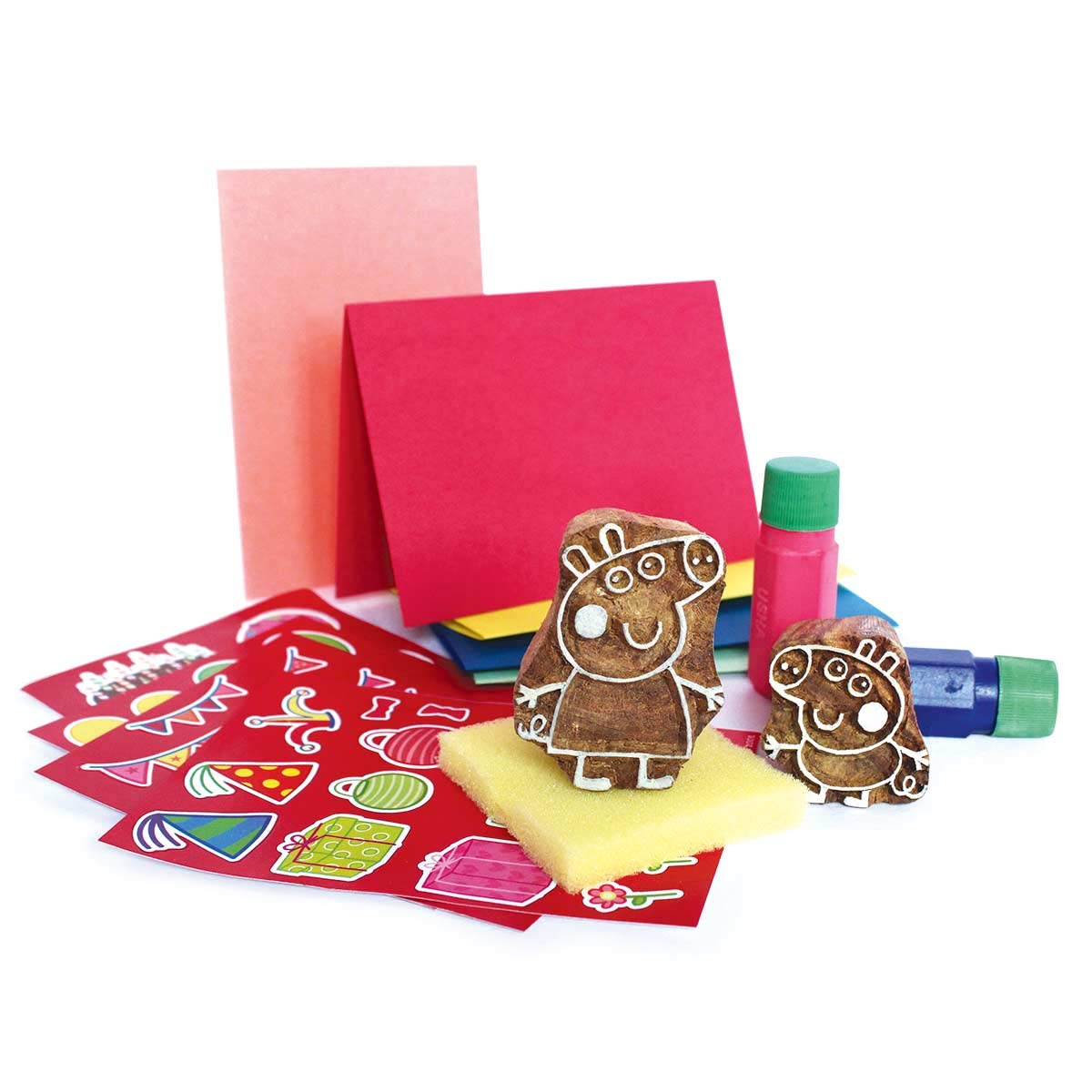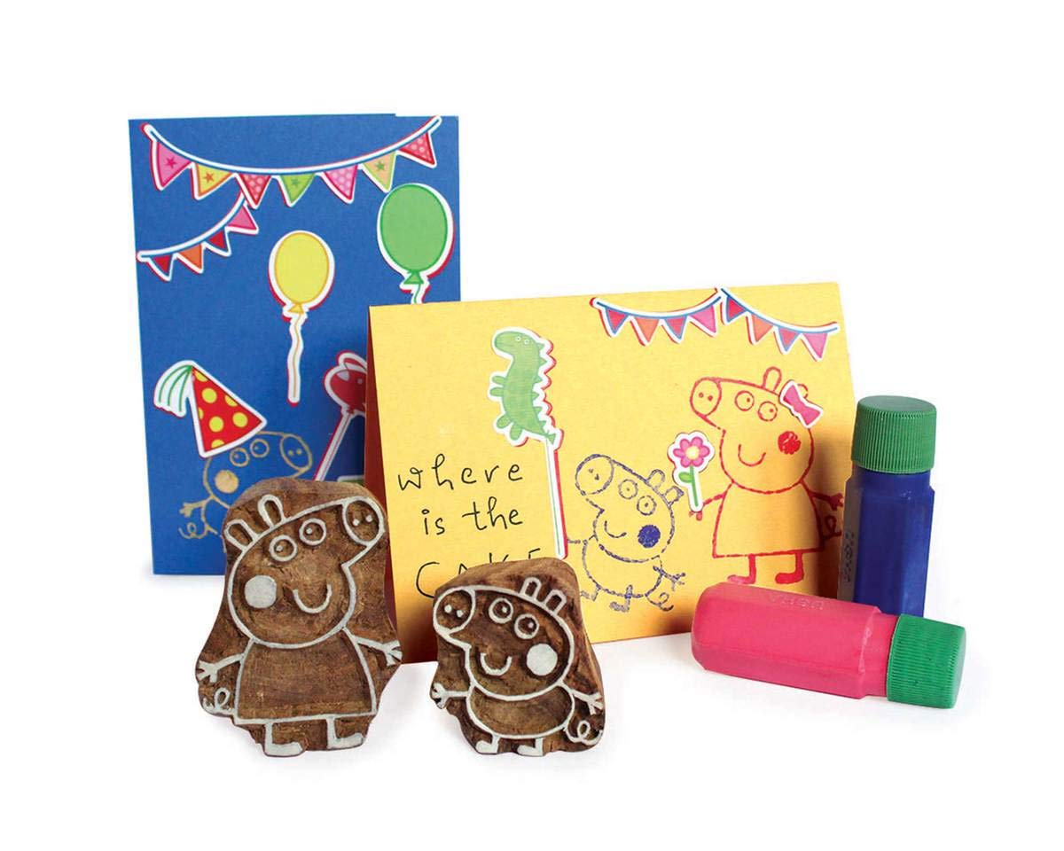 PEPPA PIG DIY CRAFT SET: 2 wooden handcrafted blocks with Peppa pig and George Party celebration stickers 5 folded cardstock to create messages of greetings and thanks etc using the stamps stickers & 2 non-toxic paints.