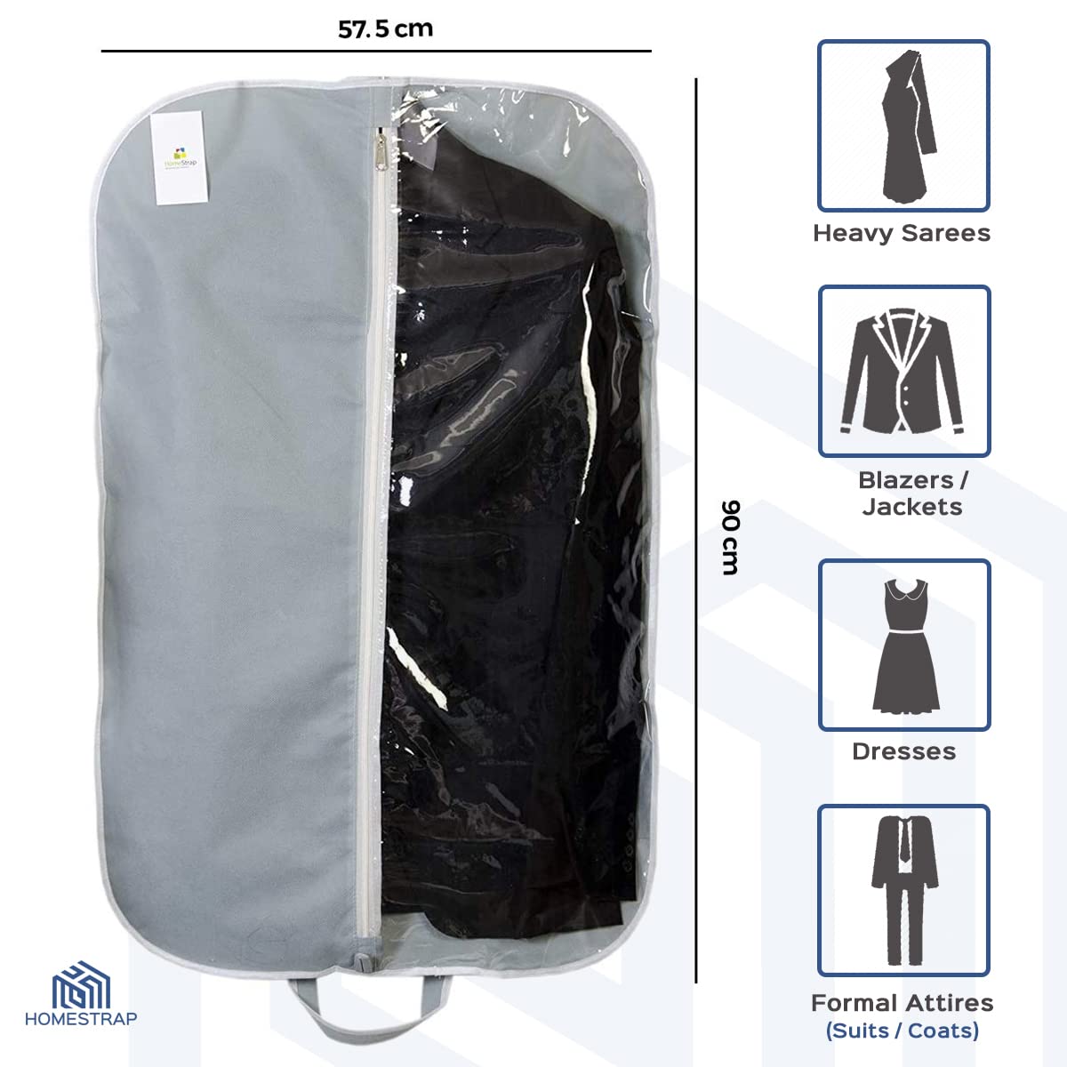 Homestrap men's coat cover to store and organize all your favorite suits blazers jackets coats etc. It has one side transparent PVC to instantly know what is kept inside without opening the cover again and again. It is made up of heavy GSM non woven fabric to make it long lasting and durable. The non woven fabric protects your stuff inside from moisture dust dirt pollens etc. Just fold it and carry it while on the go.