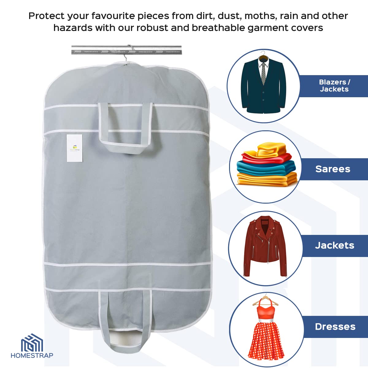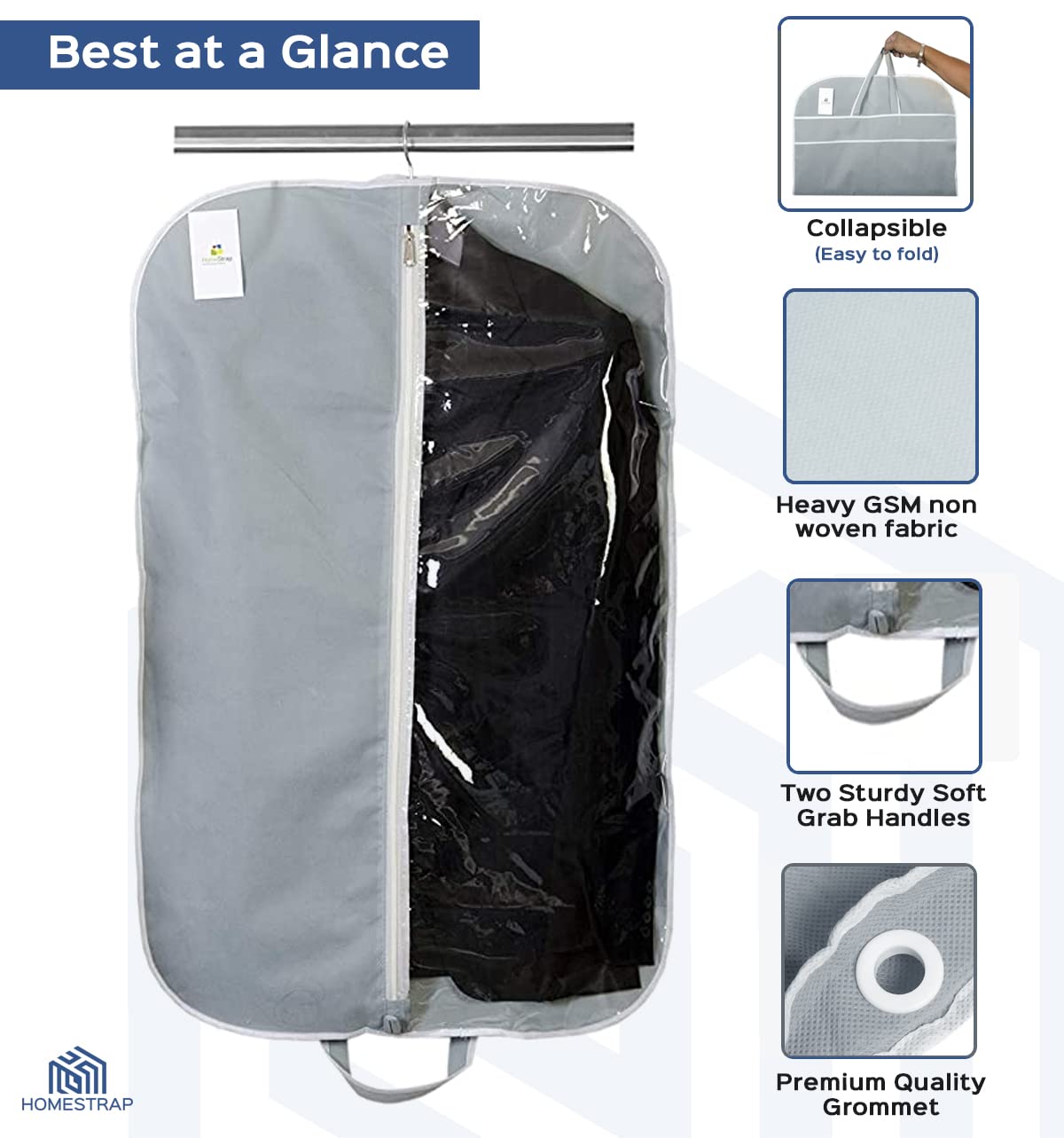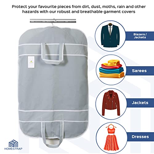 Homestrap men's coat cover to store and organize all your favorite suits blazers jackets coats etc. It has one side transparent PVC to instantly know what is kept inside without opening the cover again and again. It is made up of heavy GSM non woven fabric to make it long lasting and durable. The non woven fabric protects your stuff inside from moisture dust dirt pollens etc. Just fold it and carry it while on the go.