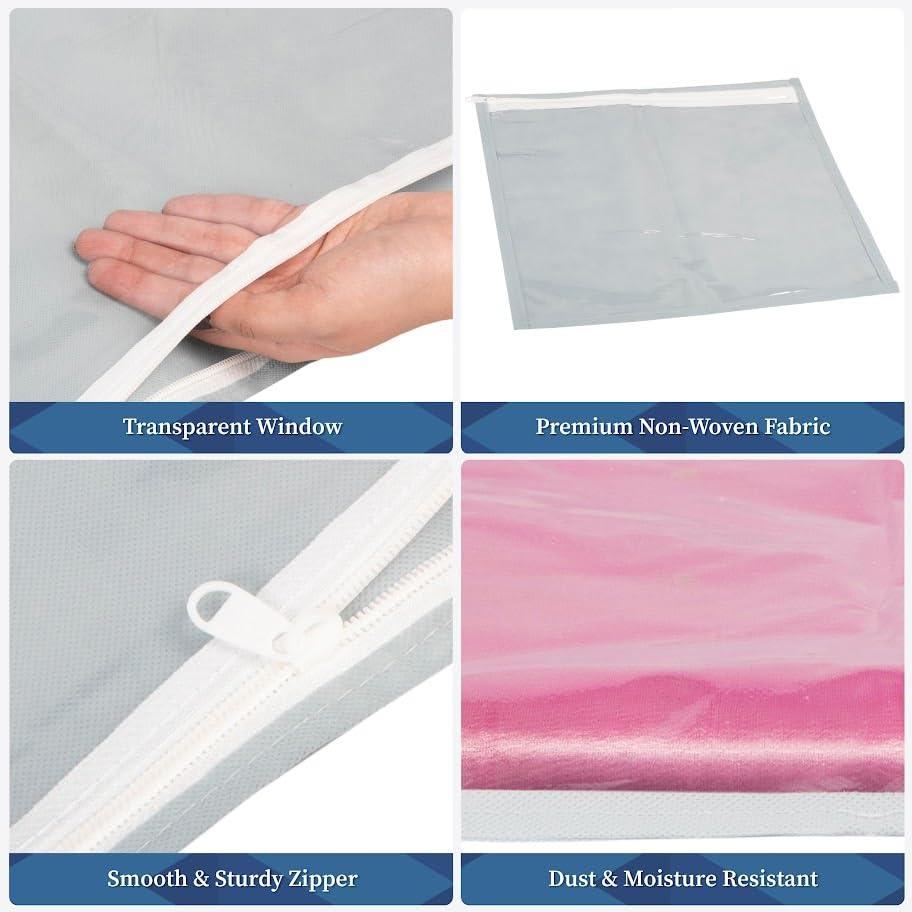 HomeStrap Brings an innovative Home storage solution for all your storage problems. Saree covers for your convenience. It is the perfect solution to keep expensive sarees and other garments in one bag to avoid dust insect and moisture. Transparent plastic view from the front for your sarees. It is made with good quality Fabric with clear Thick plastic Top for inside view It is provided with anti-slide zipper - making it lightweight and durable. Every wedding and the festive season finished you need to organize the off-season sarees into your closet or under-bed if you put the sarees in the closet or under bed directly they may look dirty when you wear them in next season the saree bags will protect your sarees and keep them clean. These saree bags Organizing your suitcases or travelling bags is therefore very easy. Keep your sarees in these storage bags and stack them neatly in your cupboard which can protect your sarees from dust This could be a perfect home to bedsheet regular cotton or silk sarees Lehenga garment suit heavy wedding saree single saari blouse dress shirt t-shirt coat blazer baby Kids toys.