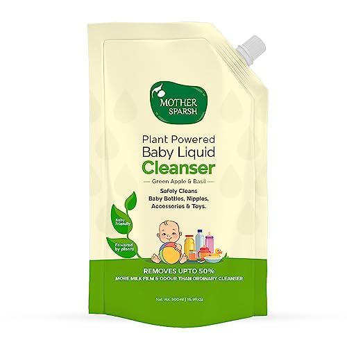 Mother sparsh natural liquid cleanser is made with the edible ingredients like green apple & basil. It removes up to 50% more milk film and odour than ordinary cleanser from the feeding bottles pacifiers nipples and babys toys. It helps in eliminating even the toughest stains and bacteria from the babies accessories & keep them safe as it is formulated without parabenssulfatessls and mea.