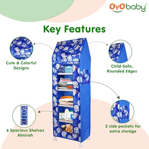 OYO BABY Kids Wardrobe for Storage 6 Shelves | Heavy Duty Plastic Almirah for Baby Clothes, Toys & Books Rack | Compact Storage Organizer for Nursery/Bedroom [Cartoon Printed - Blue]