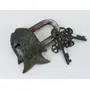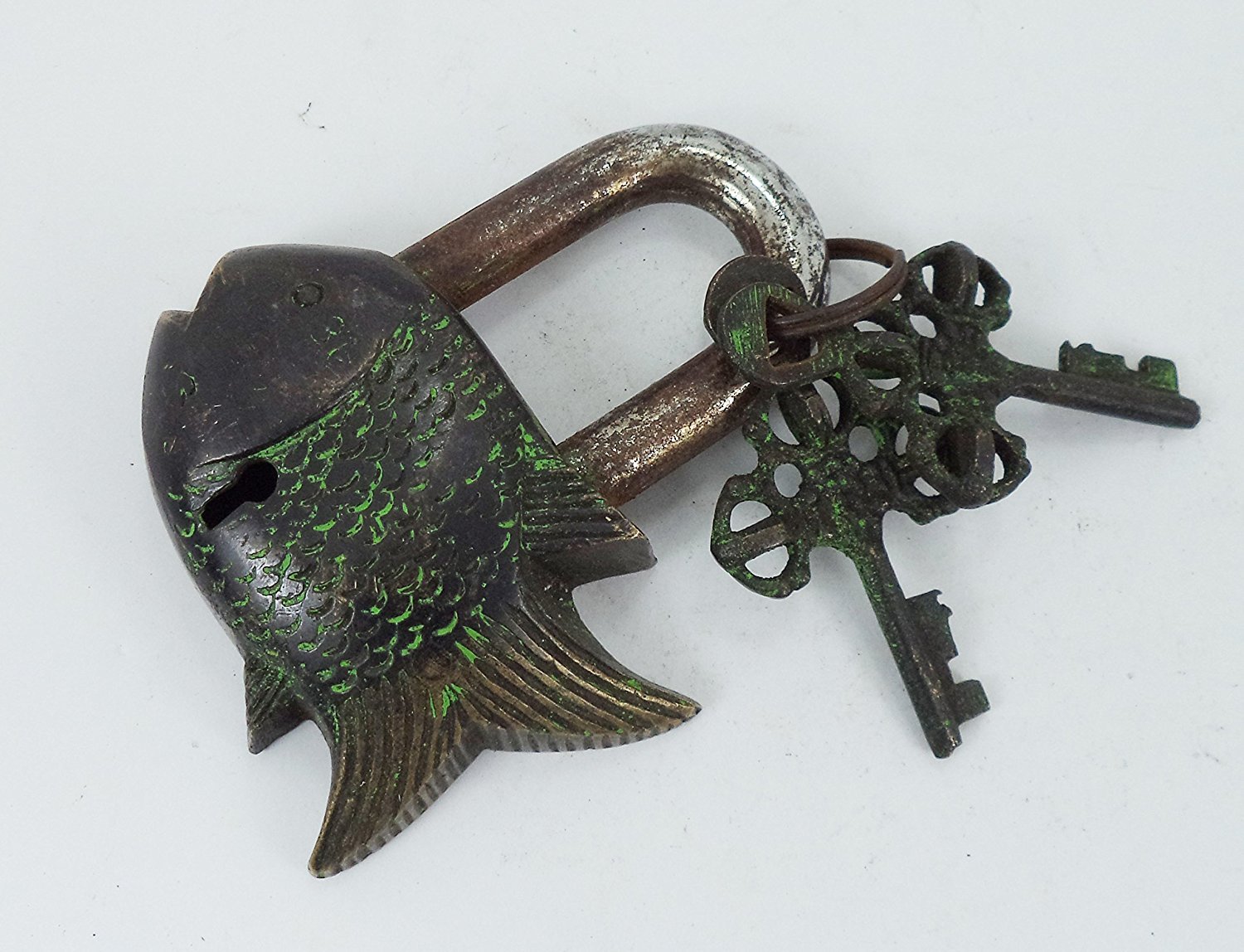 The Functional Brass Black Fish Padlock 3.5" with Two Keys Made from Solid Brass This functional Padlock has the shape of Fish This beautiful of an ancient Tibet Padlock is 3.5 inch high and 1.75 inch wide and weighs 298 Grams The back of the lock has traditional Tibetan Buddhist Mantra is sculptured . The Lock is sturdy and functional and comes with a set of 2 keys. This is Not the Vintage or Antique Product. Please Look The Image before you Purchase. The Item is 100% same as per our Images. We have made the rusty to the Lock with Chemical for the Vintage Look. But This is not Vintage Item . This is Functional and You have to Drop a little bid Oil for Function Freely .