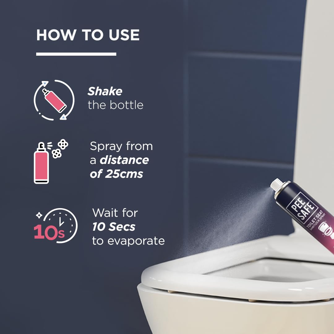 Pee Safe Toilet Seat Sanitizer Spray protects you from germs found in public toilets and s your of contracting infections like UTI. The spray kills 99.9% of germs that are present on the toilet seat's surface. All you've got to spray it from a distance of 25cms and wait for 10 seconds for the spray to work its charm and evaporate.