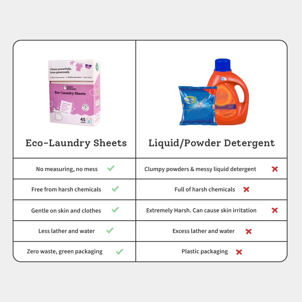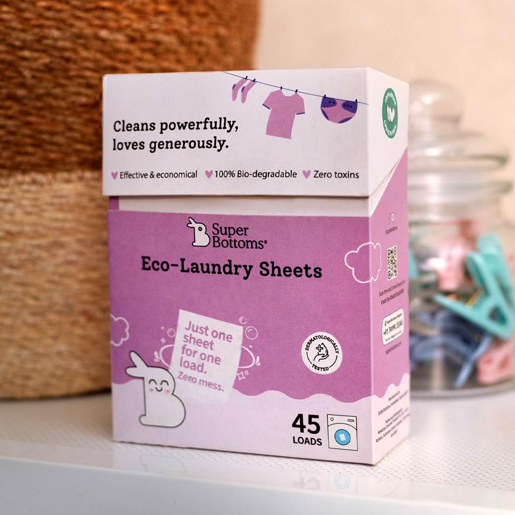 • What Are Eco-Laundry Sheets: Discover a SUPER alternative to traditional liquid/powder detergents. SuperBottoms Eco-Laundry Sheets are ultra-concentrated pre-cut and pre-measured sheets designed for mess-free powerful cleaning. Theyre eco-friendly and saf