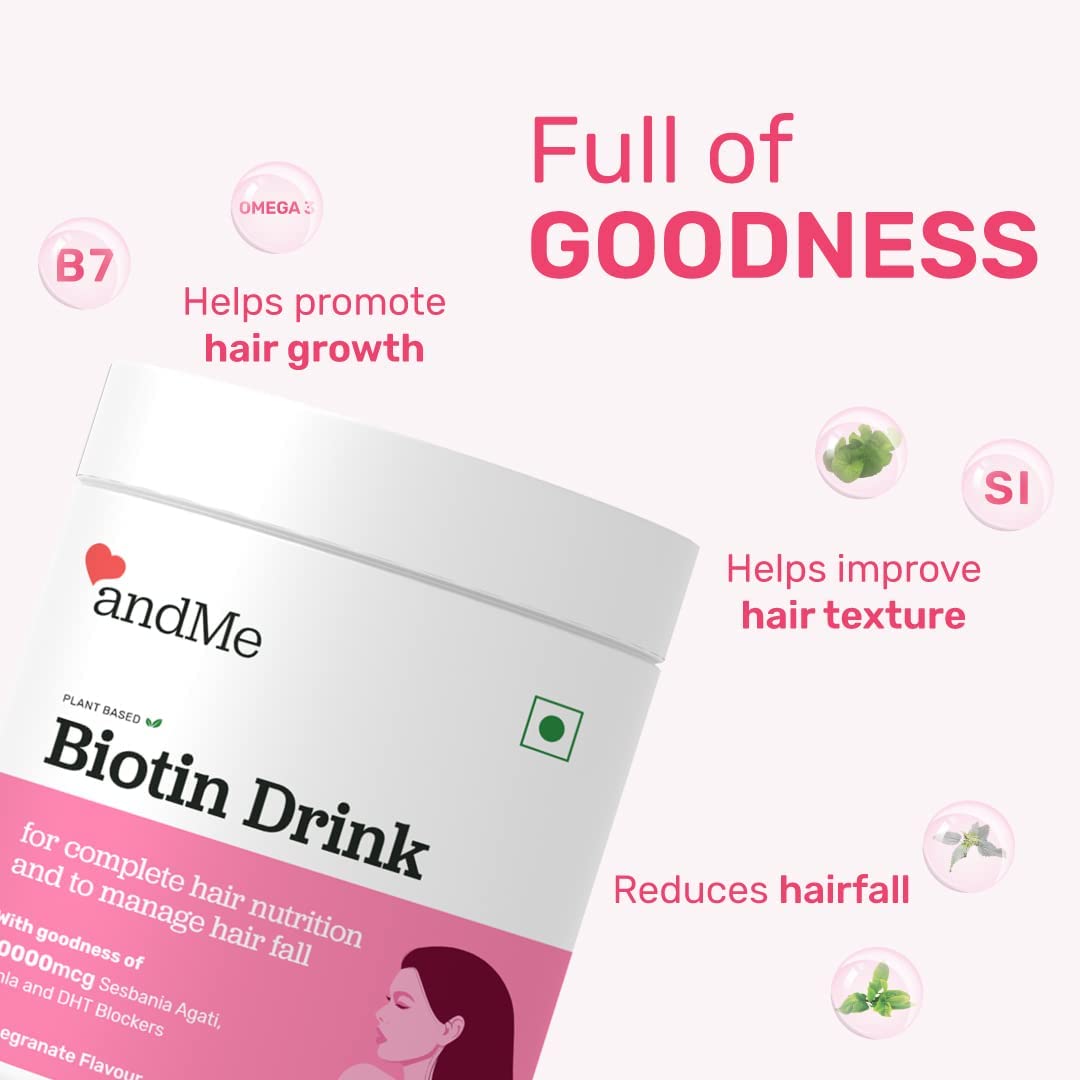 andMe Biotin for Hair Growth helps reduce dryness of hair and helps repair hair damage. It helps improve hair elasticity and reduce split ends. a dietary source for Vitamin B7 vital for the body to help convert food into energy. Keratin is a basic protein that makes up your hair skin and nails. Itâs clear that biotin improves your bodyâs keratin infrastructure. Taking biotin helps reduce hair loss strengthen hair and add shine