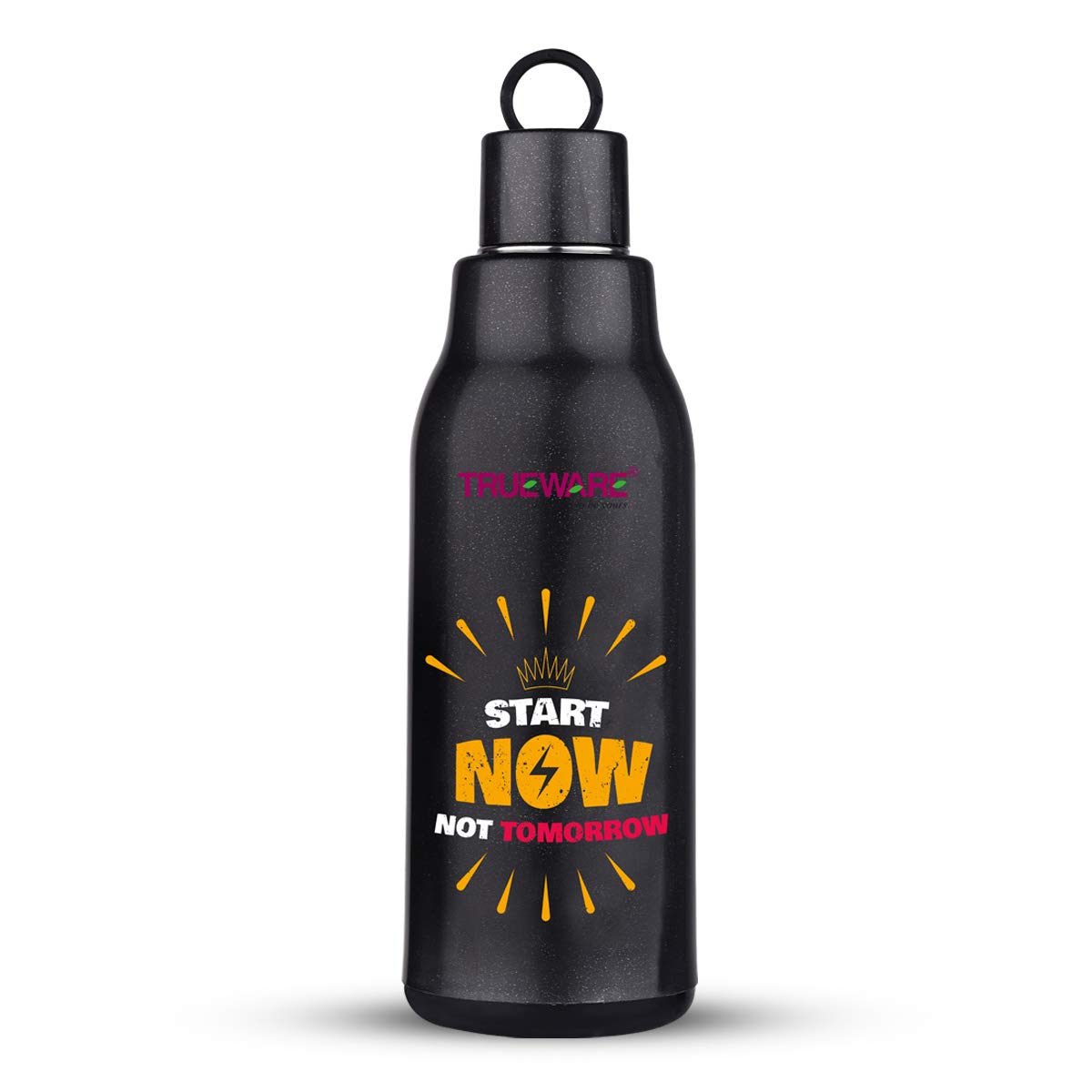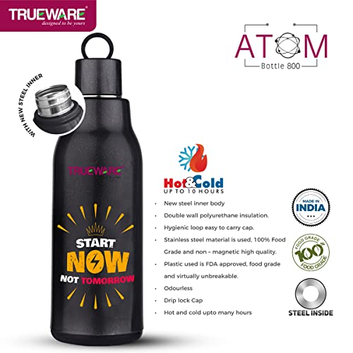 Trueware Atom water Bottle is made up with insulated 100% Food Grade Stainless Steel inside with a smooth easy to clean finish. It is a versatile and handy product that makes storing beverages hot / Cold at home School College office easily. It is ergonomically designed light weight and firm grip with attractive design. It has ring strap to carry easily. It is easy to store in bag. The taste and nutritive value of the drinks remain intact. It has flip- top lid which is convenient to use with single hand. You can store Hot and cold beverage upto many hours. It is tough and sturdy for daily usage.