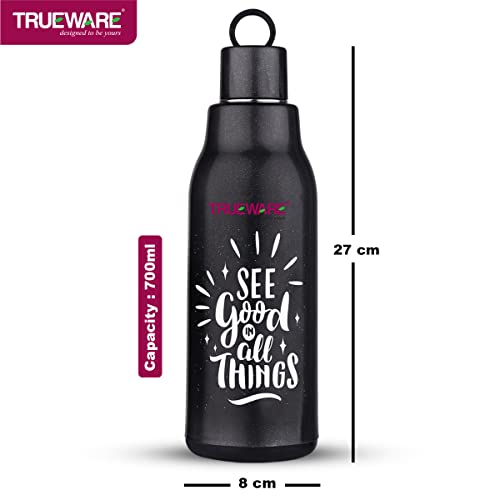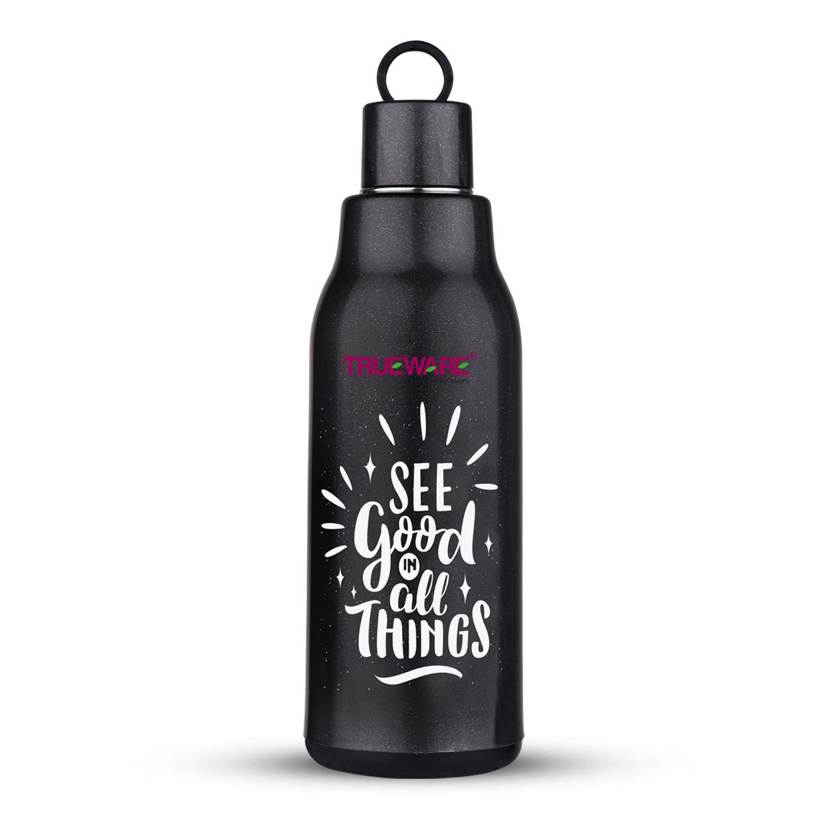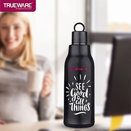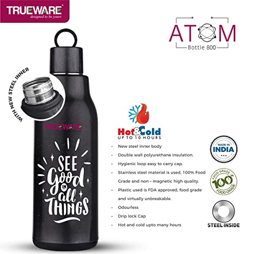 Trueware Atom water Bottle is made up with insulated 100% Food Grade Stainless Steel inside with a smooth easy to clean finish. It is a versatile and handy product that makes storing beverages hot / Cold at home School College office easily. It is ergonomically designed light weight and firm grip with attractive design. It has ring strap to carry easily. It is easy to store in bag. The taste and nutritive value of the drinks remain intact. It has flip- top lid which is convenient to use with single hand. You can store Hot and cold beverage upto many hours. It is tough and sturdy for daily usage.