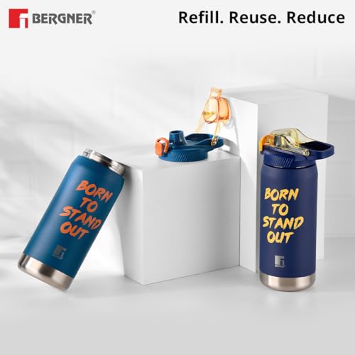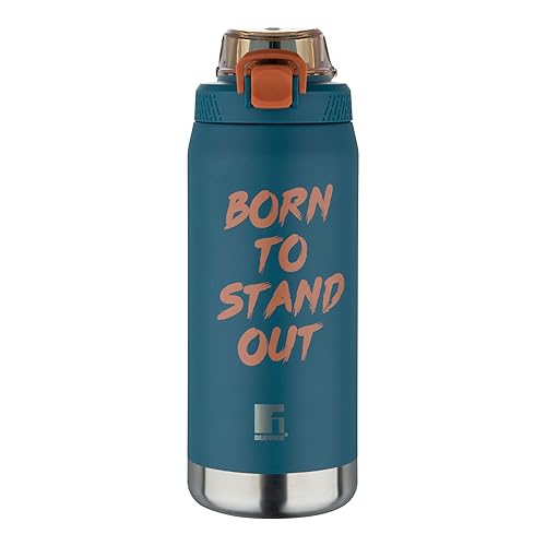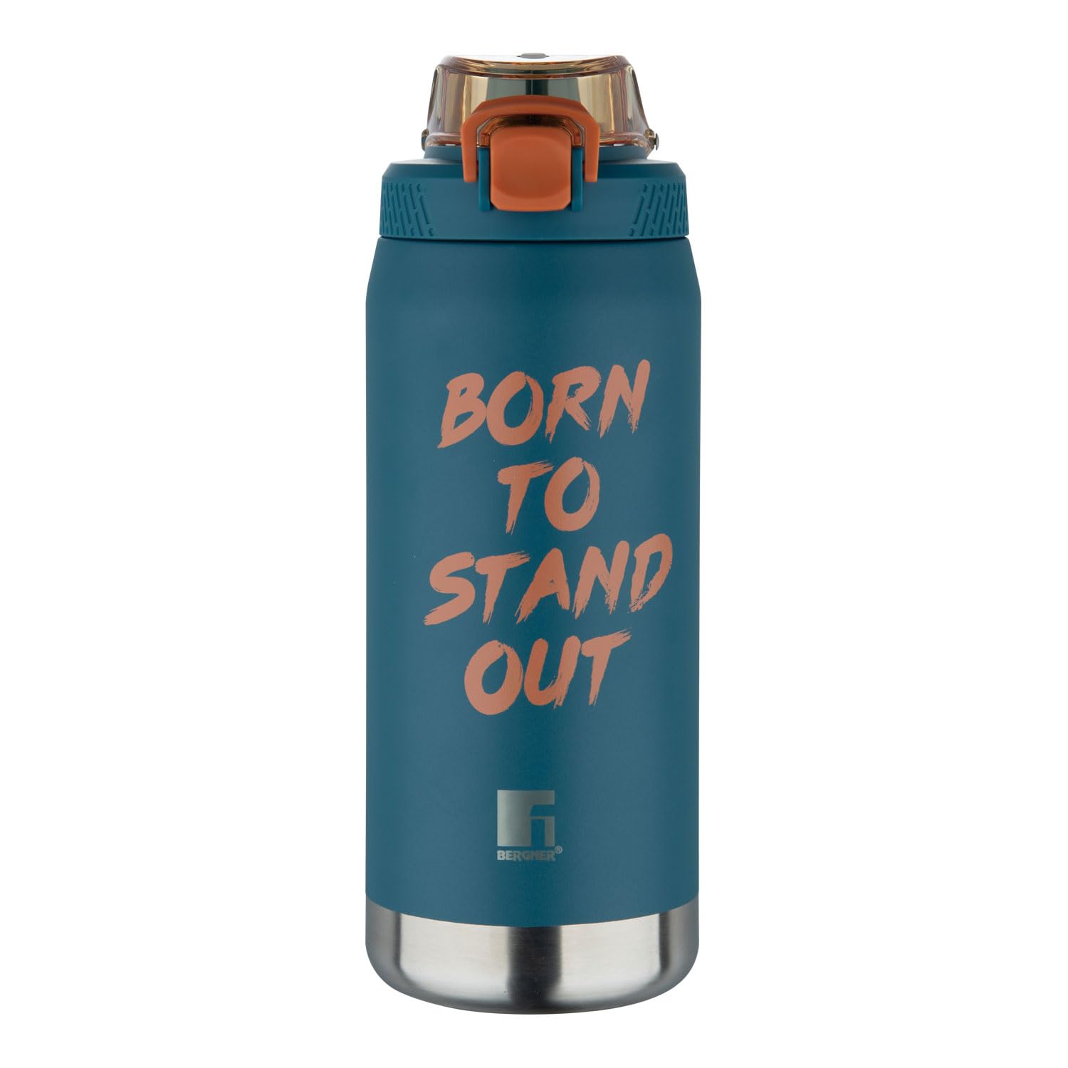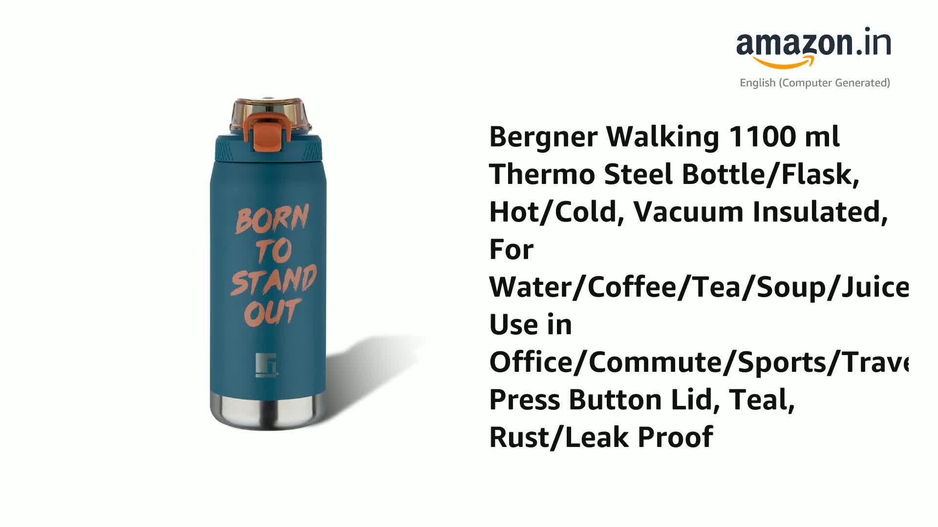 Bergner Walking 1100 ml Thermo Steel Bottle/Flask, Hot/Cold, Vacuum Insulated, For Water/Coffee/Tea/Soup/Juice, Use in Office/Commute/Sports/Travel, Press Button Lid, Teal, Rust/Leak Proof