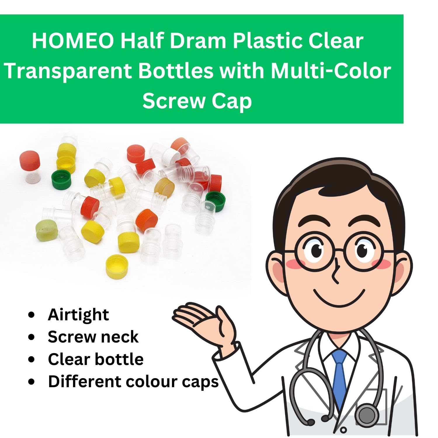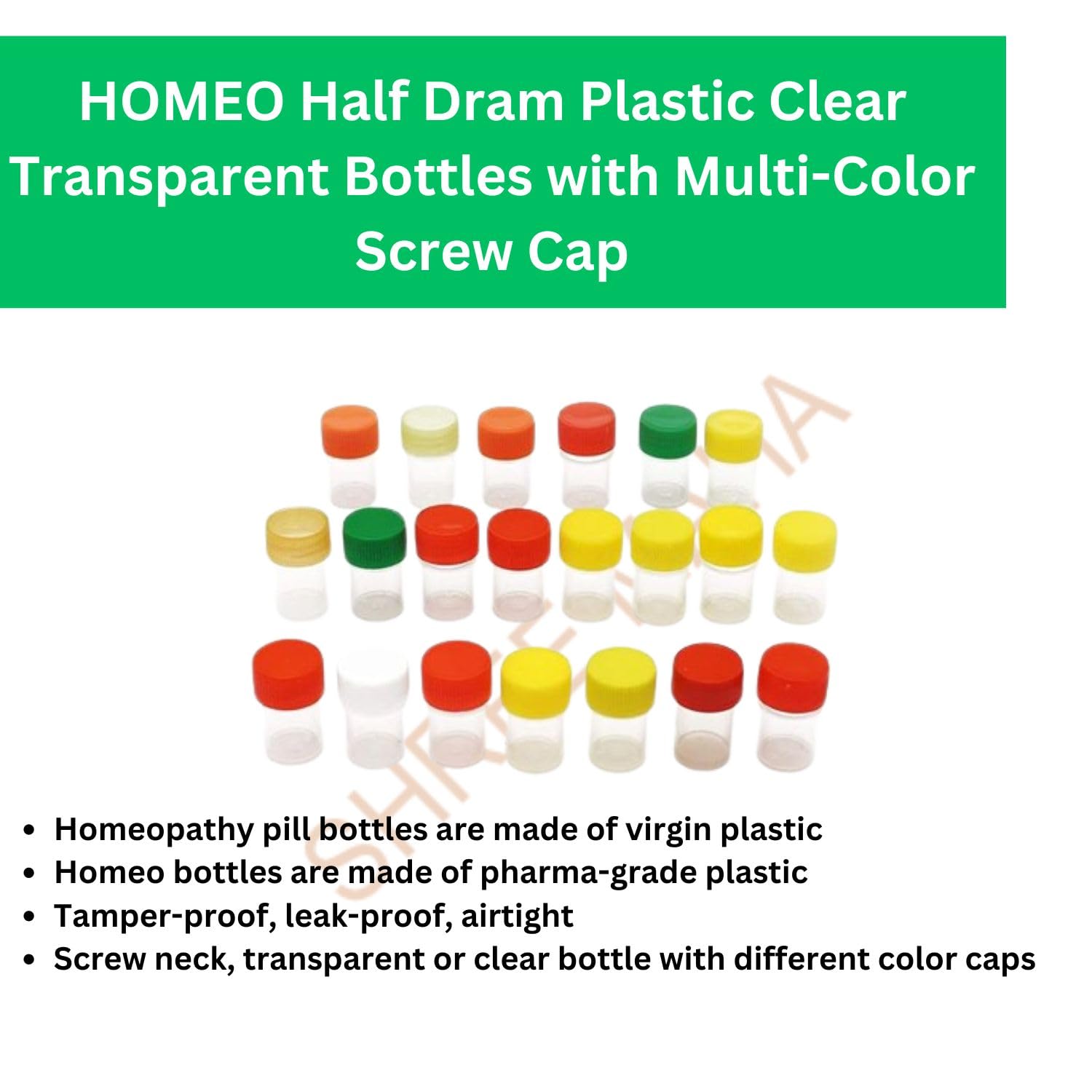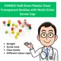 Introducing HOMEO Half Dram Plastic Vials a comprehensive pack of 144 clear transparent bottles with multi-color screw caps designed for storing homeopathy medicine. Crafted from high-quality virgin raw material these bottles ensure leak-proof and tamper-proof storage preserving the medicinal value of your remedies. Each bottle is meticulously designed to prevent contamination and maintain the potency of your medicines. With a half dram capacity they provide ample space for your homeopathy solutions while offering convenience and reliability. Upgrade your homeopathy medicine storage with HOMEO Half Dram Plastic Vials and enjoy peace of mind knowing that your remedies are safely preserved.