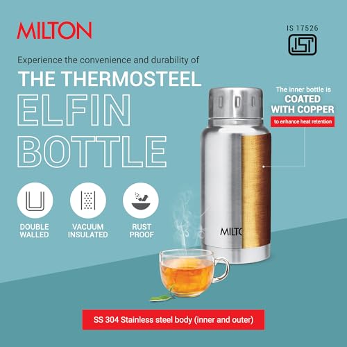 Milton Double walled vacuum insulated stainless steel water bottle keeps beverages hot and cold for long hours. Inside copper coating for better heat retention. This bottle is made from high-quality steel food-grade and BPA-free stainless steel material that makes the bottles safe for use on a regular basis. The taste and nutritive value of the drinks remains intact for a long hours making the bottle very appropriate choice for storing beverages. 100% Food grade. The mouth makes it easy to drink without spilling wherever you go whether it is work travelling and gym. This double walled vacuum insulated Stainless Steel bottle is easy to carry they are highly durable and can withstand daily use with ease. You can use these bottles to store water and other beverages without the fear of breaking them. The ergonomic design of the bottles makes it easy for you to hold them while pouring out the beverage. These bottles can even be carried in the side pocket of your backpack.