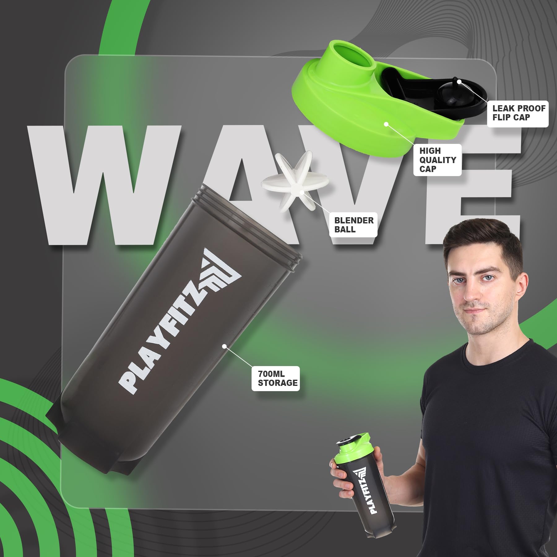 PLAYFITZ Wave Gym Protein Shaker Bottle for Pre-Post Workout | Water Bottle | With Blending Wheel | Leakproof with Sturdy Ideal for Protein Supplement & BCAAs BPA Free Sipper (700ml | Green | Set 1)