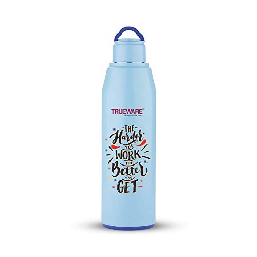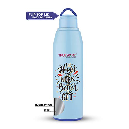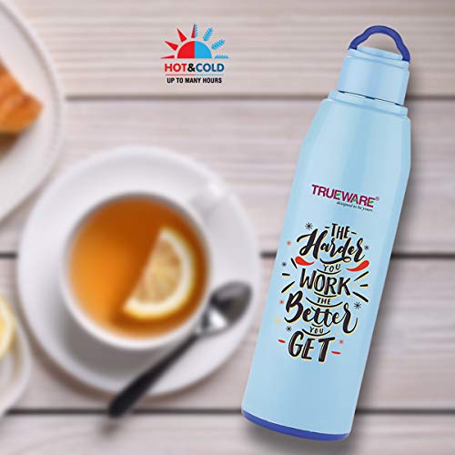 Trueware Sunshine water Bottle is made up with insulated 100% Food Grade Stainless Steel inside with a smooth easy to clean finish. It is a versatile and handy product that makes storing beverages hot / Cold at home School College office easily. It is ergonomically designed light weight and firm grip with attractive design. It has ring strap to carry easily. It is easy to store in bag. The taste and nutritive value of the drinks remain intact. It has flip- top lid which is convenient to use with single hand. You can store Hot and cold beverage upto many hours. It is tough and sturdy for daily usage.