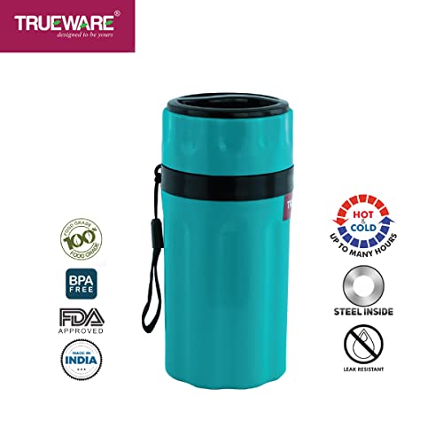 Trueware Tuff Flask Double-wall polyurethane Insulated handy flask is designed to keep yours beverages hot/cold for long hours. Its stainless steel body on the inside and high grade plastic body outside (bpa free and fda certified) which makes it a highly utility and a spill proof flask. It has twisted top lid for storage compartment to keep tea bags sugar in cubes/ crystal form coffee medicines protein powder etc. Wide mouth to fill and clean easily. It is easy to carry with a strap. This Flask is perfect for on the go daily usage on buses trains etc and for gifting as well.