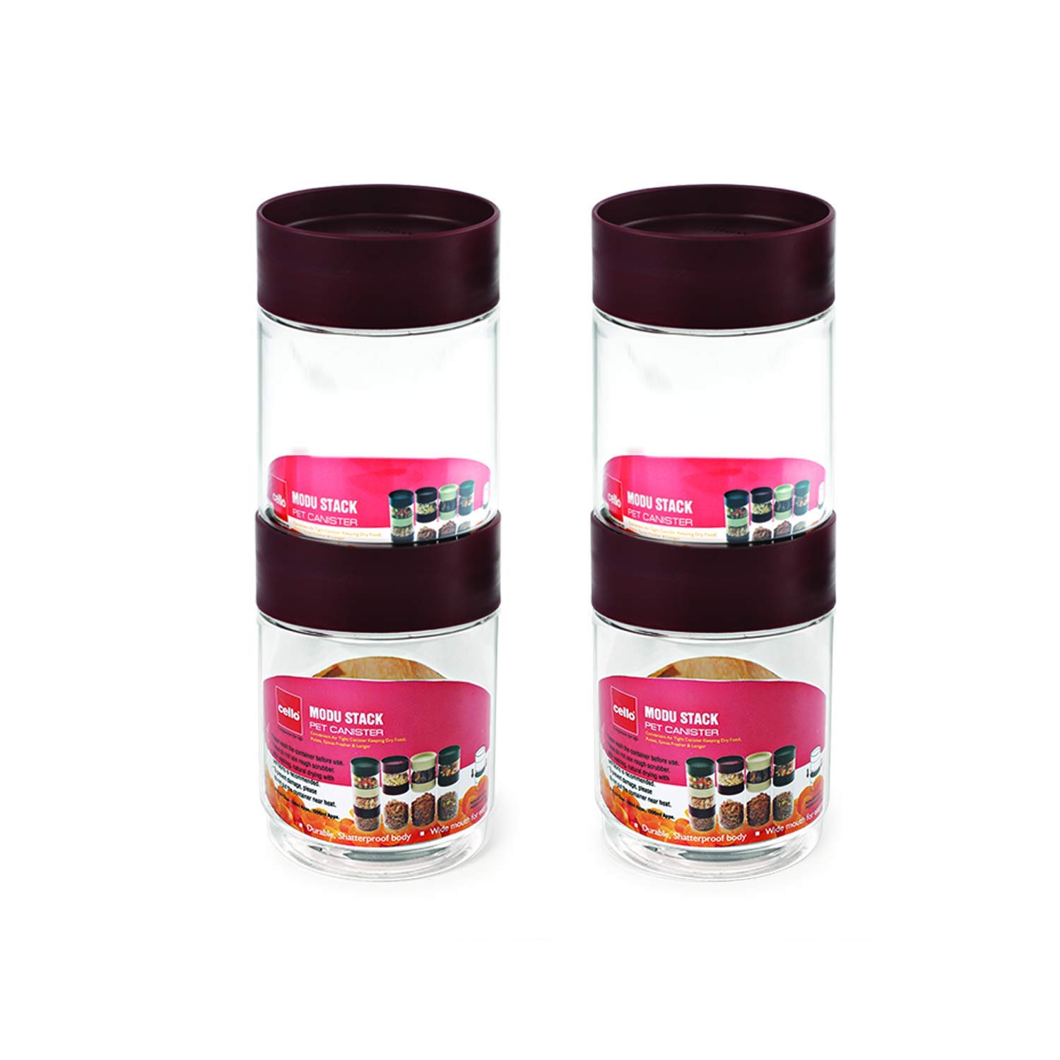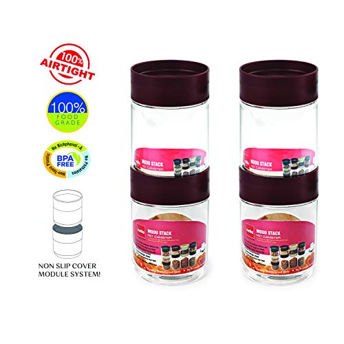 CELLO Modustack Stackable Container Set | PET Plastic Jar with Air Tight Lid | For Storage of Food, Pulses, Spice, Cereals, Cookies, Dry Food | 750ml | Set of 4, Maroon