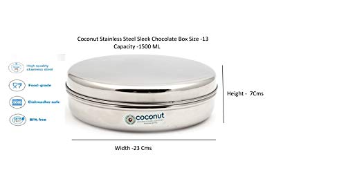Coconut Multipurpose Chocolate Box Stainless steel Storage box is range of innovative and quality products for home and kitchen.Product is made from superior quality Stainless steel. It is sturdy and easy to clean / maintain. Product body is made from jointless technology and hence will not leak or rust even in tough conditions. Easy to clean and diswasher safe.Container 1 - 6.5 Inches Width & 1.5 Inches Height.