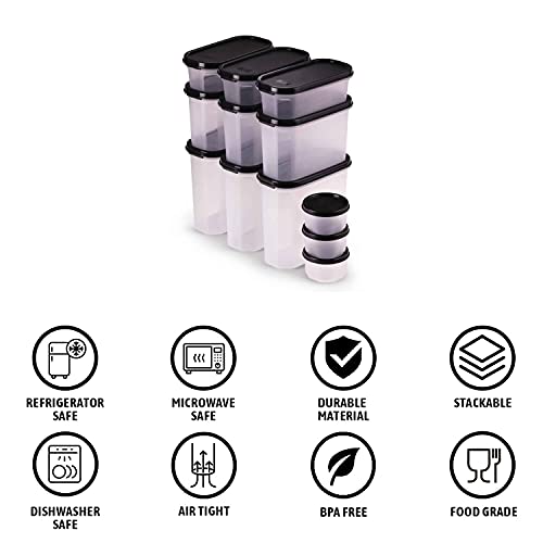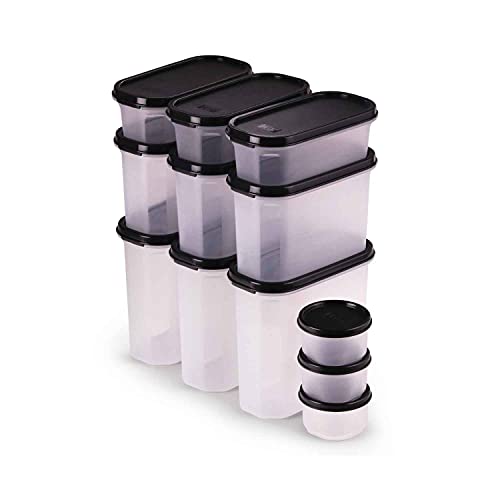 Oliveware Modular Storage Containers | Organised Kitchen | Stackable | Durable | For Pulses Rice Dal Atta Flour Cereals Snacks | Set of 12 - 3x1800ml 3x1200ml + 3x600ml + 3x180ml (Black)