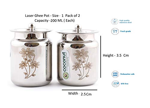 Coconut is range of innovative and quality products for home and kitchen. Stainless steel laser ghee pot highly durable and made of stainless steel ideal for oil or ghee or sugar stylish and elegant product for modern kitchens its easy to store in kitchen cupboards.