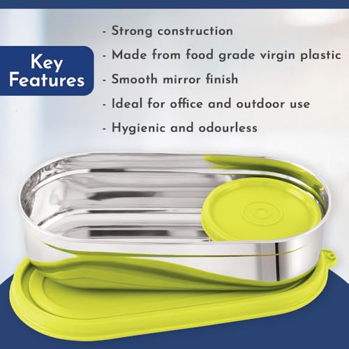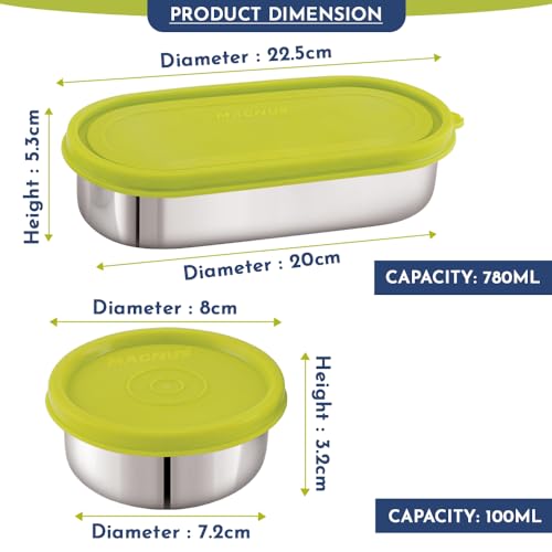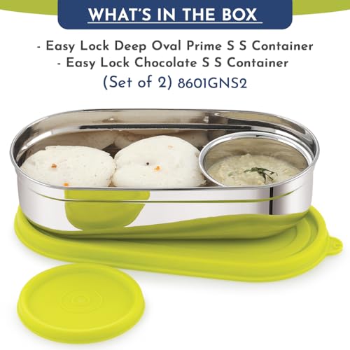 HomeKitchenContainersLunch BoxesMagnus Easy Lock S S Deep Prime Oval & Chocolate Container, Airtight & Leakproof Lid,Tiffin for School, Office,Picnic, Ideal Lunch Boxes for Men, Women and Kids (Green,100ml,780ml)