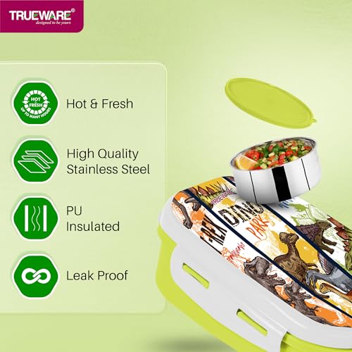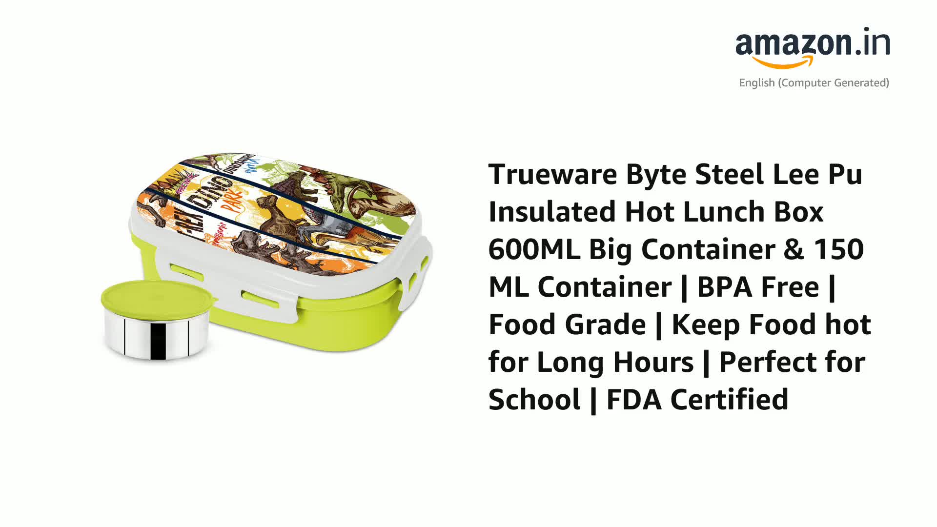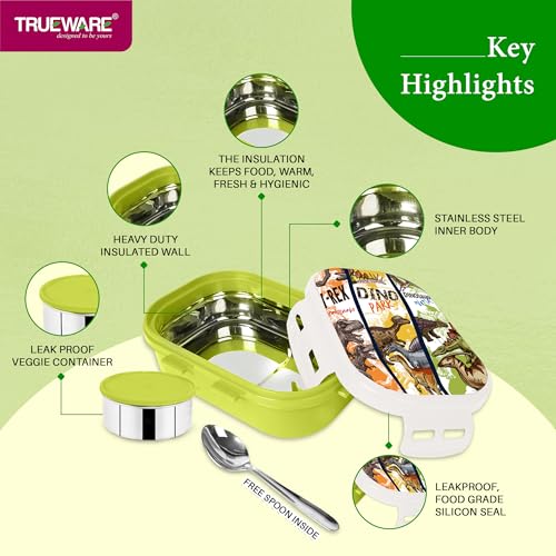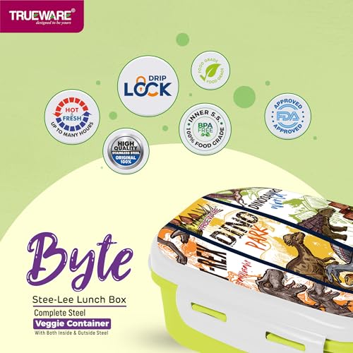 Trueware present byte Lunch Box. New Complete veggie container with both inside and outside steel. Keep Food hot for long hours. Perfect for school going Kids and office. Made in India. Attractive Design. Drip Lock High Quality Stainless Steel BPA Free Food Grade FDA Certified Keep Food Hot for Long Time Leak Proof Container for Dry and Wet Food Air Tight Double Wall Pu Insulated 1 Big Container & 1 Veggie Container Hot and Cold Easy to Clean Made in india Stainless Steel Inner Silicon Seal Backpack compatible Spill leak-proof design 4 Sided Drip lock Insulated Lunch Box attractive designs 1 Stainless Spoon included.