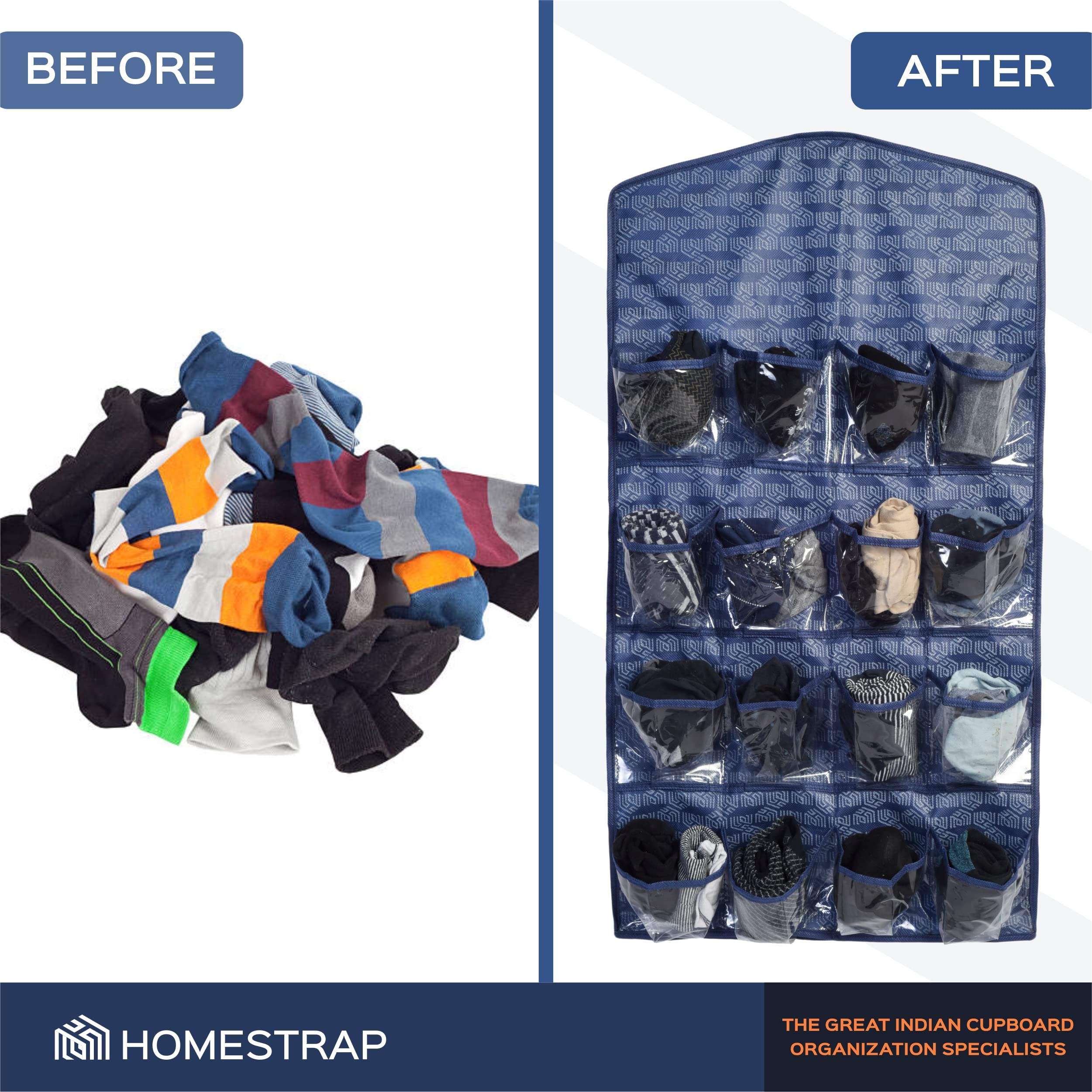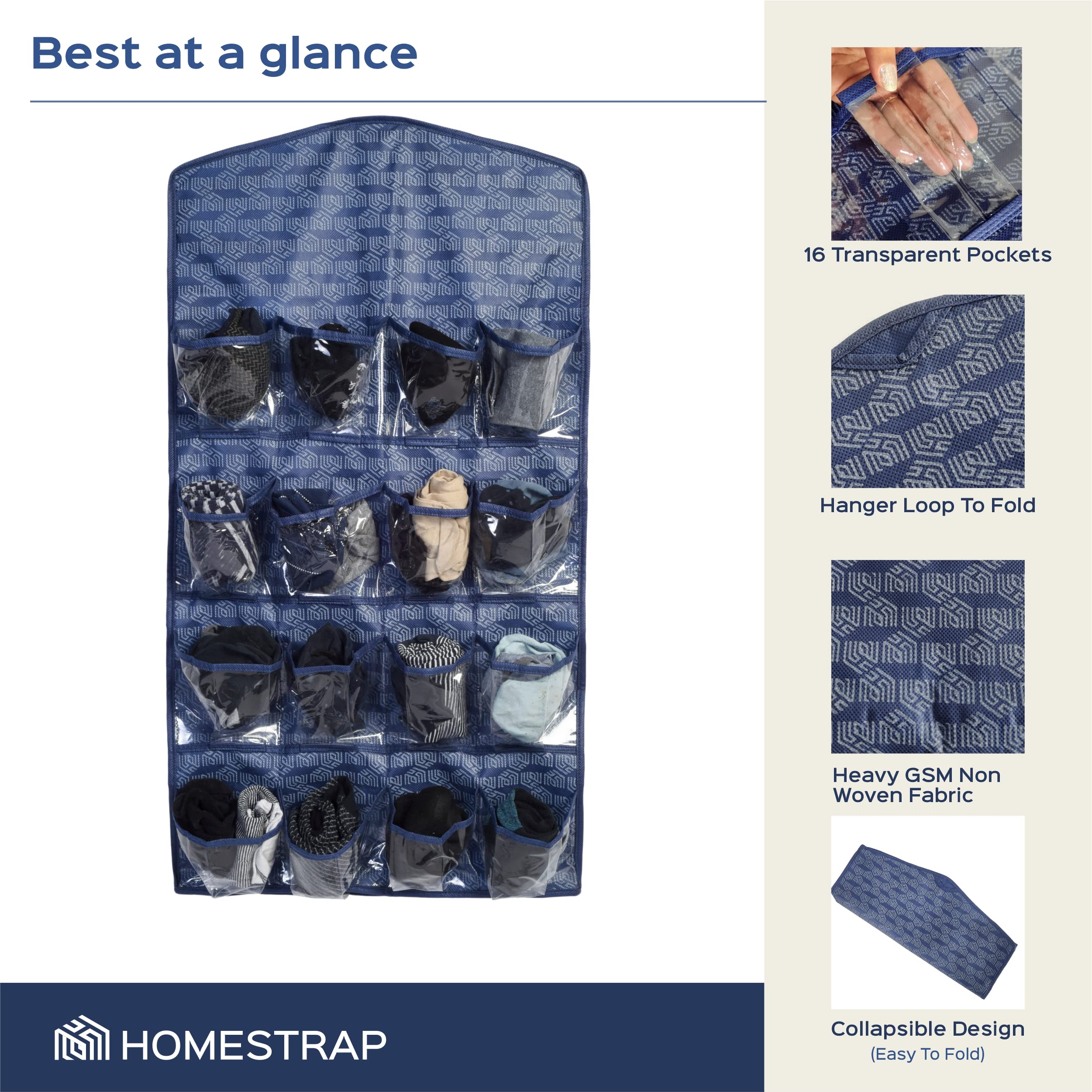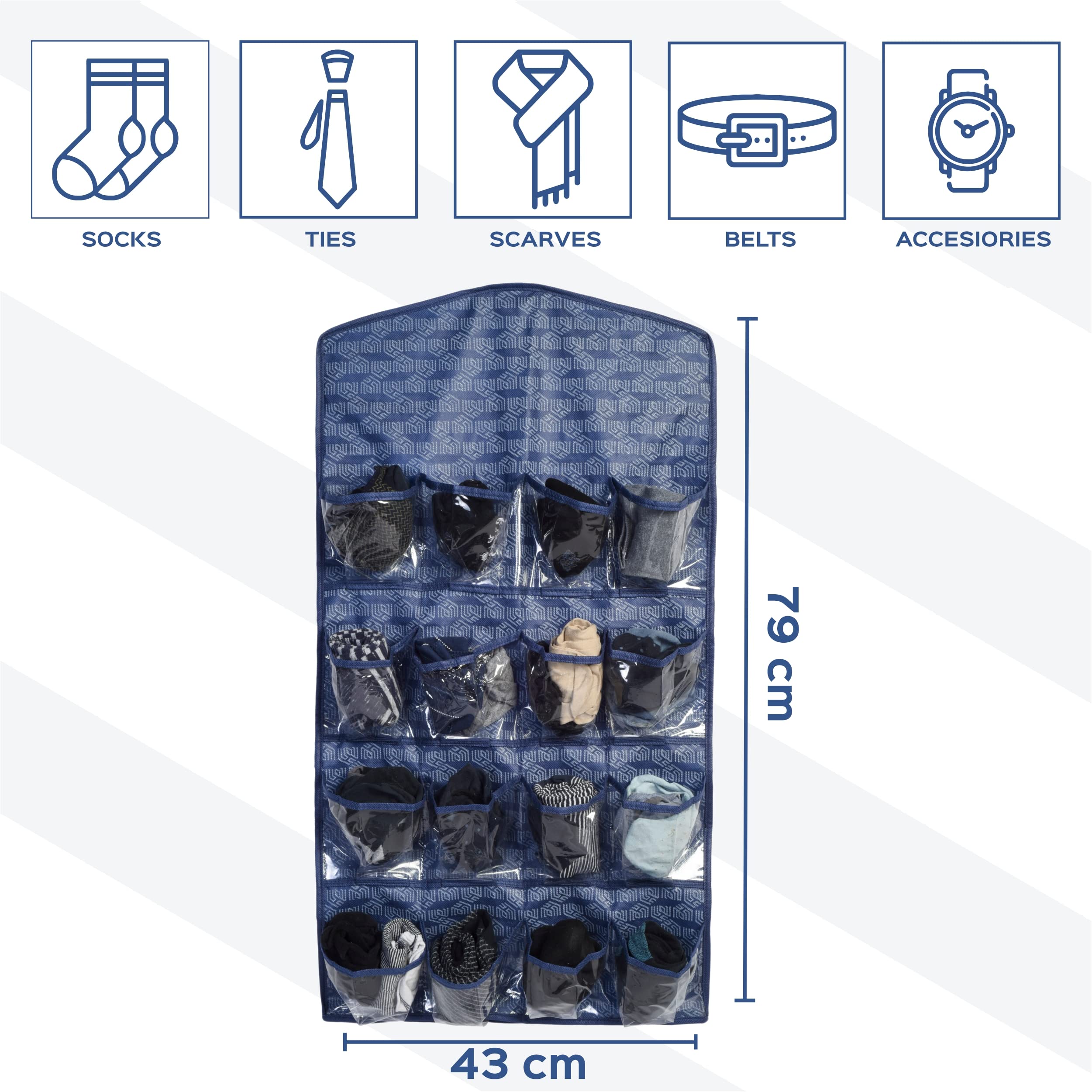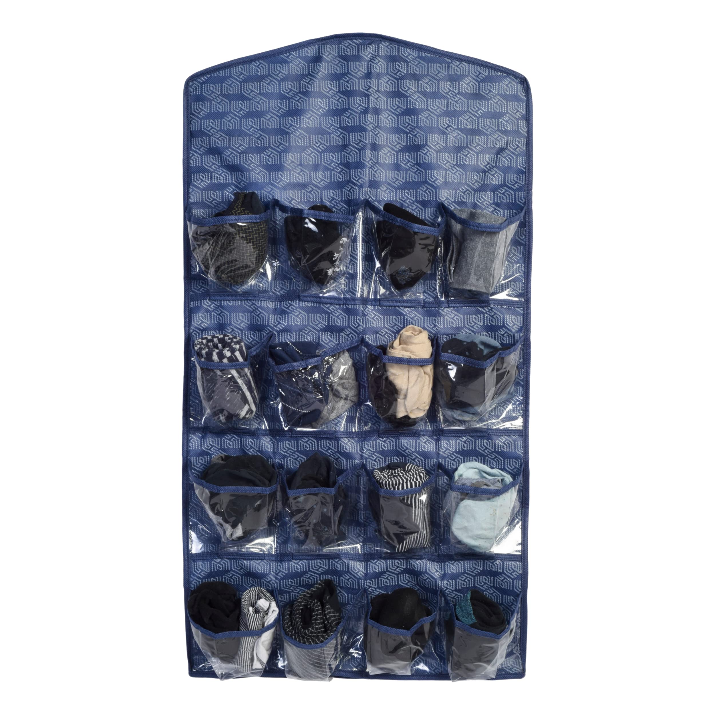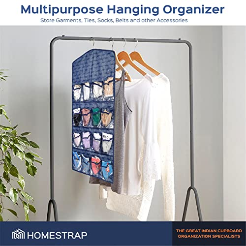 Homestrap Printed Hanging Wardrobe Organizer with 16 Transparent Pockets Organizes Socks Undergarments Belts Ties Scarfs (Navy Blue)