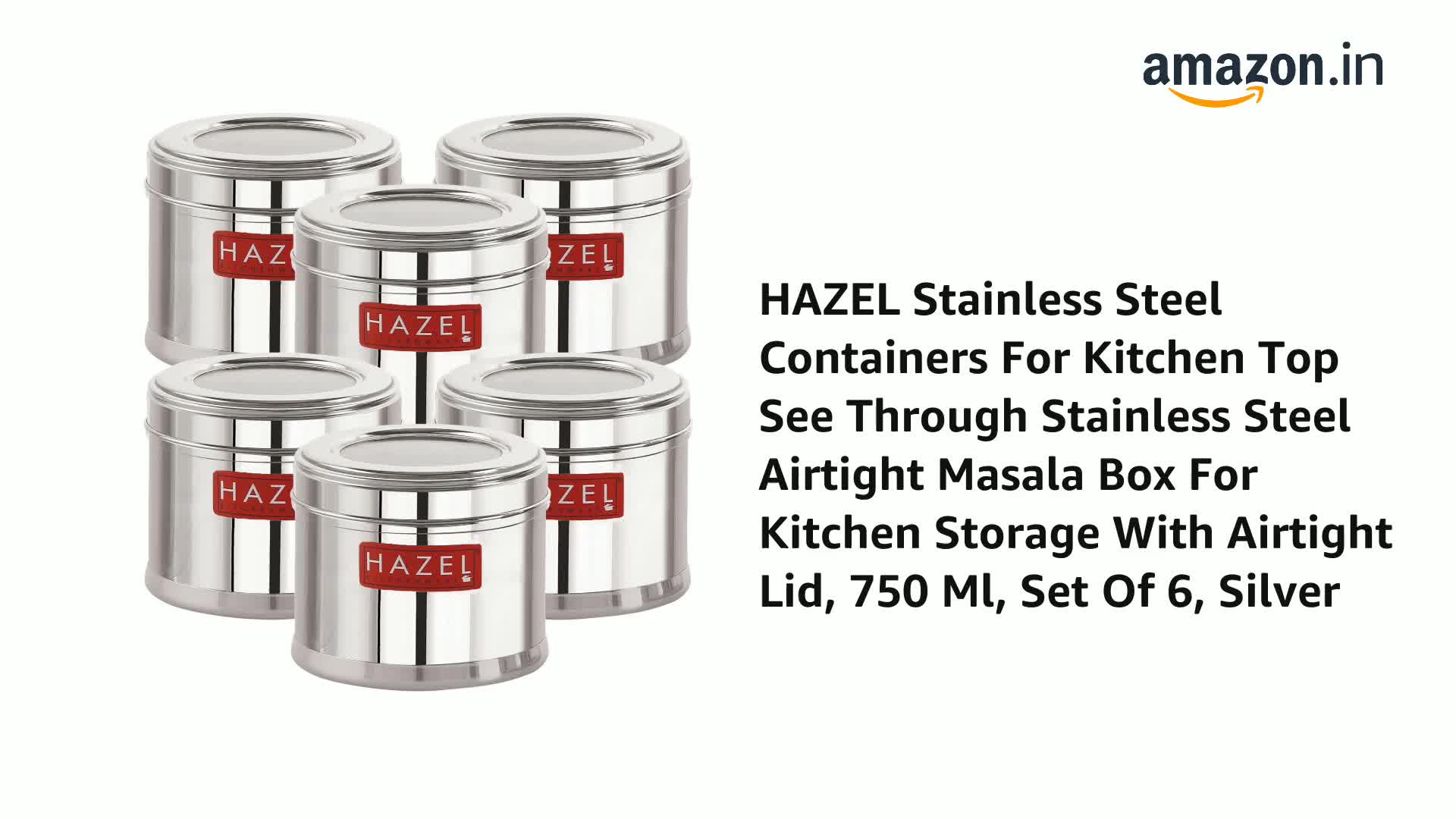 HAZEL Stainless Steel Containers for Kitchen | Top See Through Stainless Steel Airtight Masala Box for Kitchen Storage with Airtight Lid, 700 ML, Set of 6