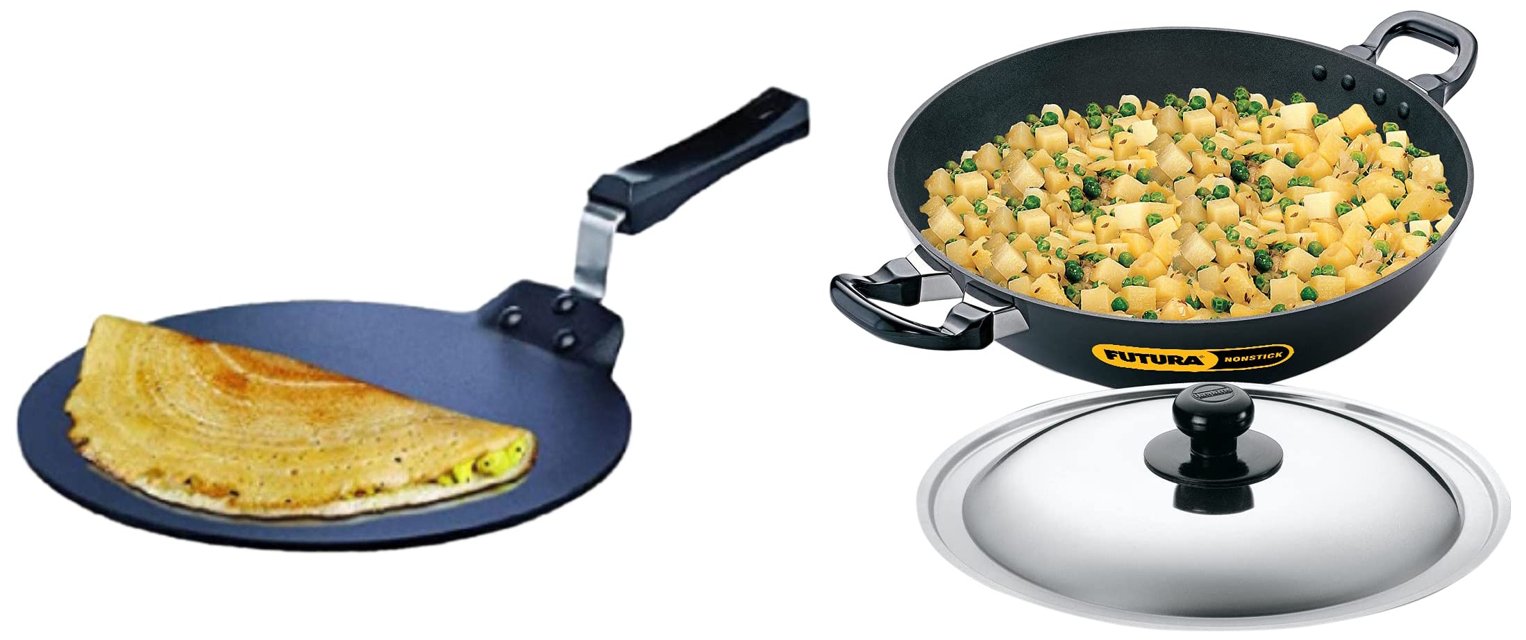 Hawkins - Q28 Futura Non-stick Dosa Tava 28 cm BlackThe Dosa Tava is designed with just the right curvature and thickness to give you the best cooking results when making dosa (rice and gram pancakes). The flange which firmly attaches the handle with strong stainless steel rivets is uniquely designed to not interfere with the cooking surface and to hence maximise the cooking area allowing you to make a very large dosa or several uttapam or cutlets at one time. The 4.88 mm extra thick heavy gauge metal ensures fast and even heat conduction and retains heat well. The Dosa Tava Instruction Manual has 11 tested recipes for the Dosa Tava including four varieties of dosa uttapam cutlets and rolls. The Dosa Tava is suitable for domestic gas and radiant electric cooktops. Diameter (cm): 28 Thickness (mm): 4.88 Carton dimensions (WxDxH): 443 x 286 x 72 mm Product weight in carton: 1.06 kgHawkins Futura Non-Stick Round Bottom Deep-Fry Kadai with Steel Lid 30cmAll futura hard anodised deep-fry pans are distinguished by elegant comfortable rosewood handles fixed on sturdy stainless steel brackets which are permanently rivetted to the pans. All (except the smallest pan) have a flat bottom for stability. All have curved sides suitable for deep-frying and stir-frying. All but one of the futura nonstick deep-fry pans have a round bottom and two short handles. The exception is then 2 litre deep-fry pan (stir-fry pan) with a flat bottom and a single long handle. The round bottom pans are also eminently suitable for stir-frying. The breakfast pan (appachatty) with 0.9 Litre capacity round bottom and two rosewood handles is ideal for the quick cooking of a variety of indian and western breakfast dishes. This is a non-stick deep frying pan which can also be used for stir frying. Non-stick surface. 4.0 Litres capacity. 30 Cm diameter cooking surface. 3.25 Mm thickness. Dimensions: 15.5" L x 12" h x 5" w.