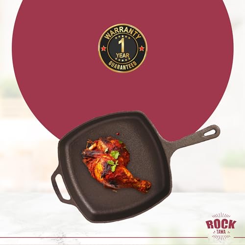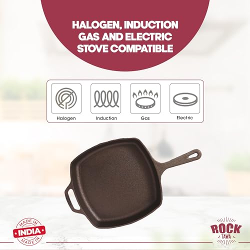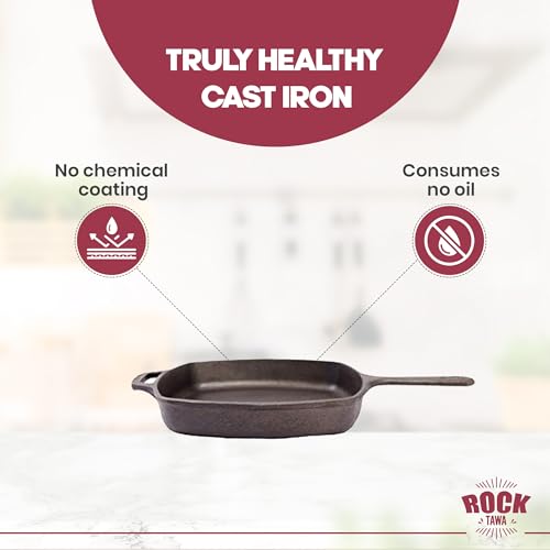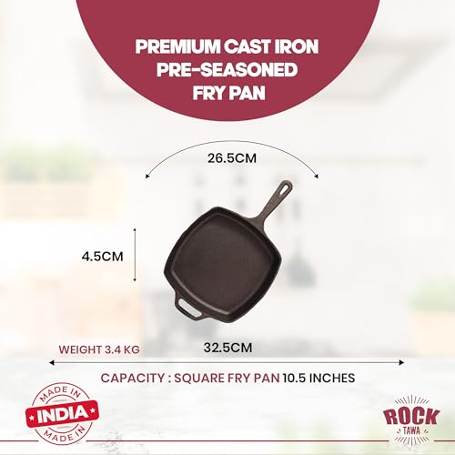 10.5 In Pre-Seasoned Cast Iron Skillet Pan From starters to desserts to deep fry or shallow fry cook your favorite item with our rock tawa pan. Our products are manufactured with the ability to withstand hard handling and last for generations. Advantages of using an iron skillet Increases the iron content in food. Even heat distribution & heat retention results in better cooking. Save Fuel. Can be used on gass stove Oven and Induction Cooker. Specifications weightt 3.2 kg Length 26.6 cm plus Handles 43.5 cm Width 26.6 cm Depth 5.1 cm Thickness 0.4 cm