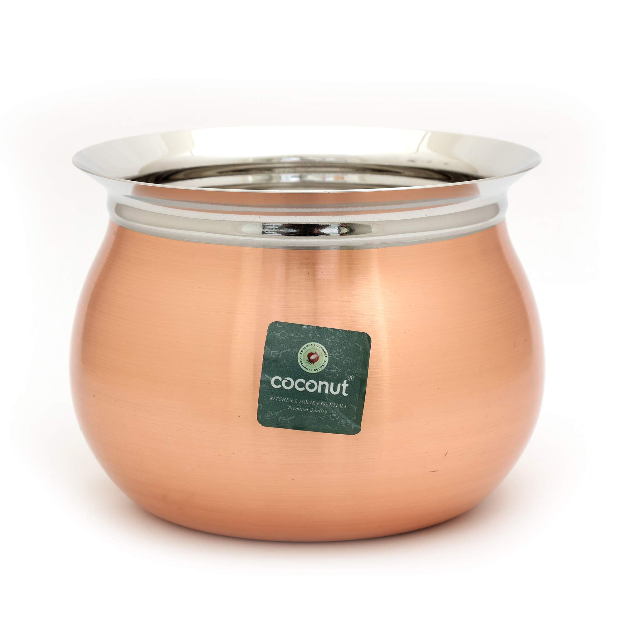 Coconut is range of Innovative and Quality products for Home and Kitchen. This Tomato FC Copper Handi is ideally used to Serve Food like Curries Dals Biryani and other Indian Dining Experience for Dinnerware products. The Stainless steel surface preserves the taste and nutritional qualities of foods and it is a Food Grade product. It is ideally used for Home Restaurants Bars and catering services which comes with Inside Stainless steel & Outside Copper Based. Product content : Coconut Tomato FC Copper Handi Cookware 1 Unit without Lid and Handle . Product Dimensions Width - 5.5 Inches & Height - 4.3 Inches Capacity 1000ML