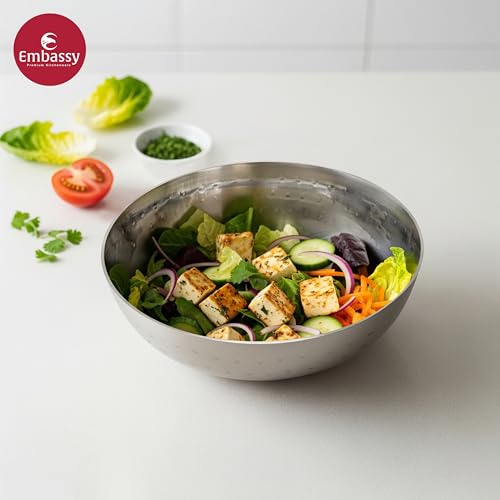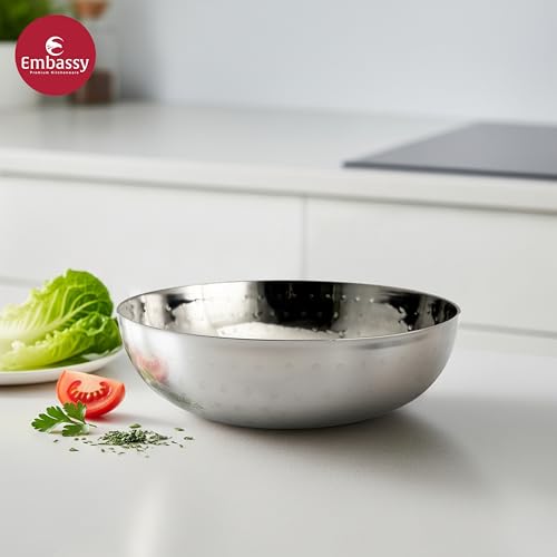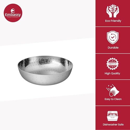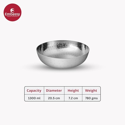 Embassy hammered tasla / kadhai (without handle) has been crafted from the stainless steel. It comes with an attractive hammered design which gives it an look and appeal. Available in 8 sizes: size 6 (325 ml) size 7 (600 ml) size 8 (700 ml) size 10 (1 500 ml) size 12 (2 500 ml) size 14 (3 500 ml) size 16 (5 000 ml) and size 18 (6500 ml).