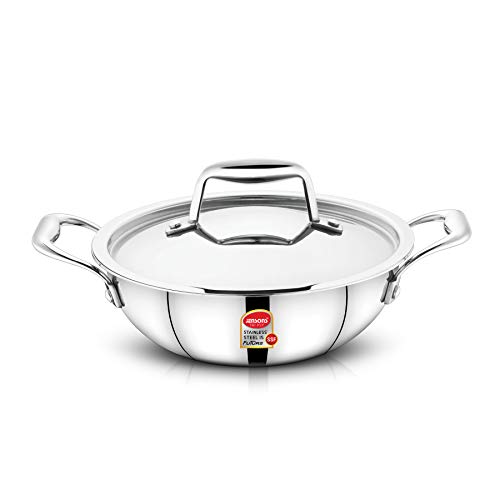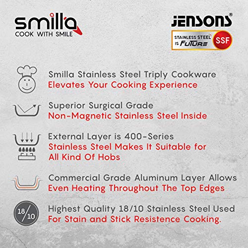 JENSONS Smilla Triply 18/10 Food Grade Stainless Steel Kadai with Stainless Steel Heavy LID-Induction Compatible-20 cm