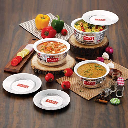 HAZEL Aluminium Hammered Finish Tope Patila With Lid Set of 9Suitable for all heat sources even heat distribution so food does not burn excellent quality easy to clean and hygienic stainless steel. It is made from the finest Aluminium and is ideal for stir-frying sauteing and even everyday cooking. Excellent for curries and vegetable dishes. It's a must have for every Indian kitchen. Cook indian dishes for your friends and family in this unique and ethnic looking Cookware Utensil. With this cookware utensil your indian style cookware experience goes several notches up. This kadhai is made of stainless steel and this kadhai has an intricate traditional hammered design to provide it a royal look. It is perfect for cooking dishes. This cookware utensil is of classy finish and gives an elegant look to kitchen decor. The superb design of the cookware makes it a great addition to your antique cookware collection.This set is made from high quality Aluminium making it exclusive and durable. Dimension : 17.7 x 17.7 x 7.5 cm (LxBxH) Diameter : 17.7 cm Weight : 330 gm Capacity : 1000 ML. Dimension : 19 x 19 x 8.5 cm (LxBxH) Diameter : 19 cm Weight : 380 gm Capacity : 1300 ML. Dimension : 20.5 x 20.5 x 9.3 cm (LxBxH) Diameter : 20.5 cm Weight : 440 gm Capacity : 1650 ML. Dimension : 22 x 22 x 9.8 cm (LxBxH) Diameter : 22 cm Weight : 540 gm Capacity : 2000 ML. Dimension : 23.5 x 23.5 x 11 cm (LxBxH) Diameter : 23.5 cm Weight : 620 gm Capacity : 2600 ML. Dimension : 25.5 x 25.5 x 11.5 cm (LxBxH) Diameter : 25.5 cm Weight : 670 gm Capacity : 3000 ML. Dimension : 27.2 x 27.2 x 12.2 cm (LxBxH) Diameter : 27.2 cm Weight : 720 gm Capacity : 3900 ML. Dimension : 28.5 x 28.5 x 13 cm (LxBxH) Diameter : 28.5 cm Weight : 840 gm Capacity : 4800 ML. Dimension : 30 x 30 x 14 cm (LxBxH) Diameter : 30 cm Weight : 1030 gm Capacity : 5500 ML.