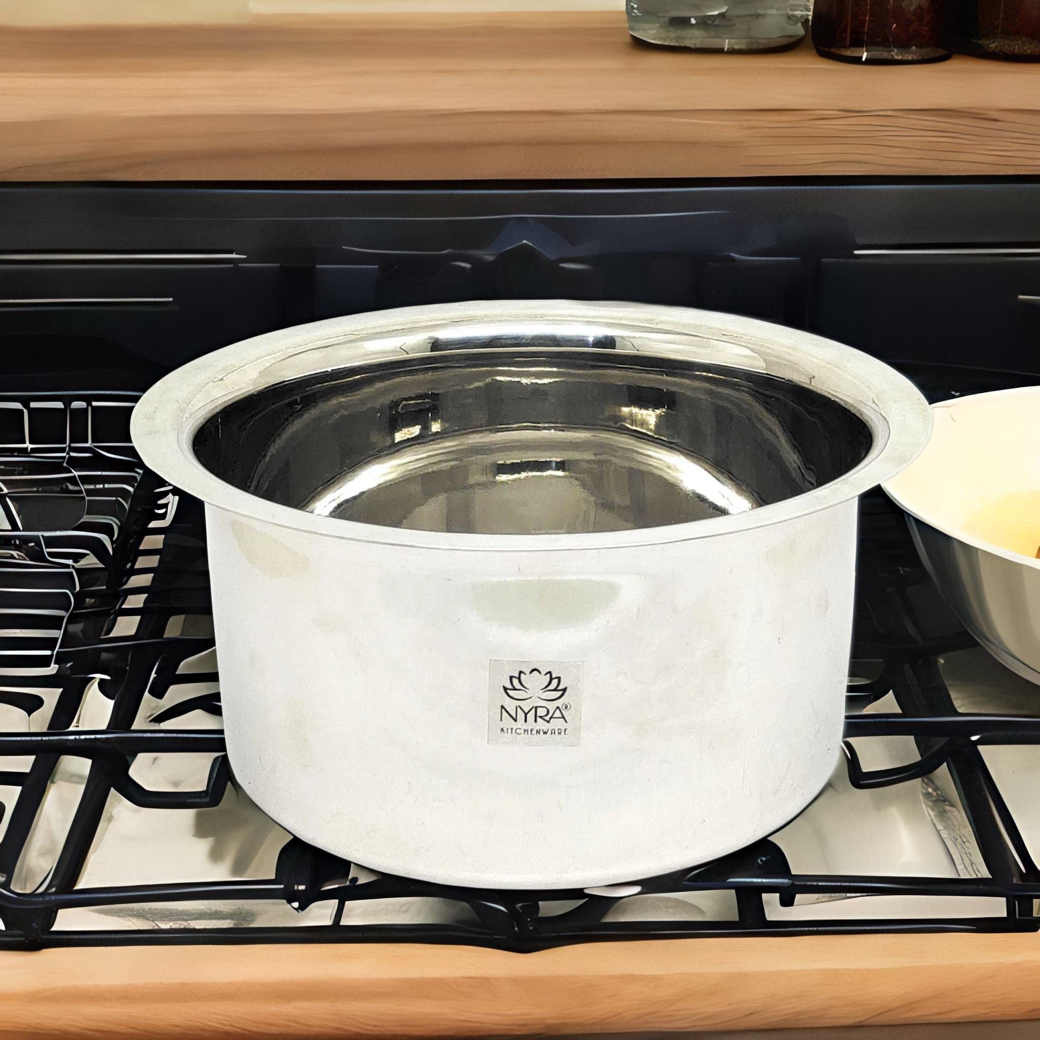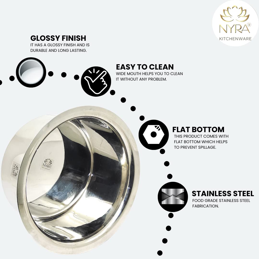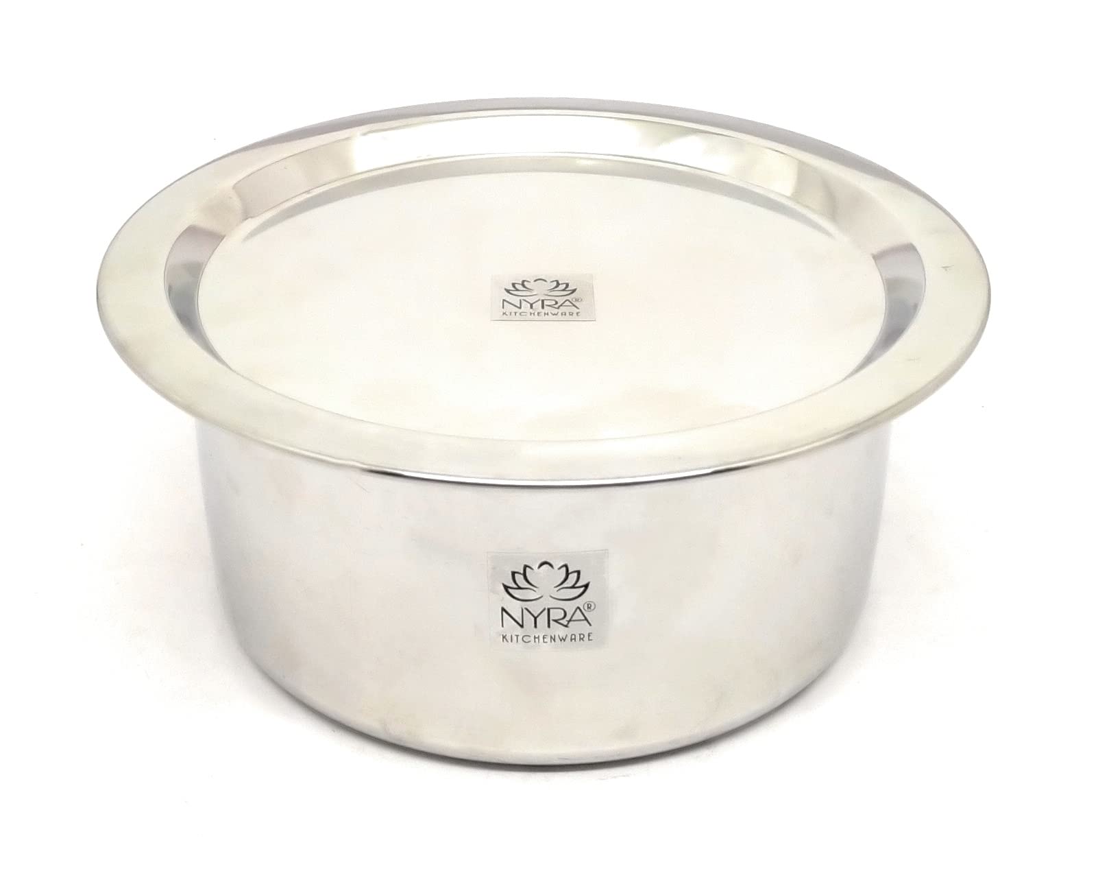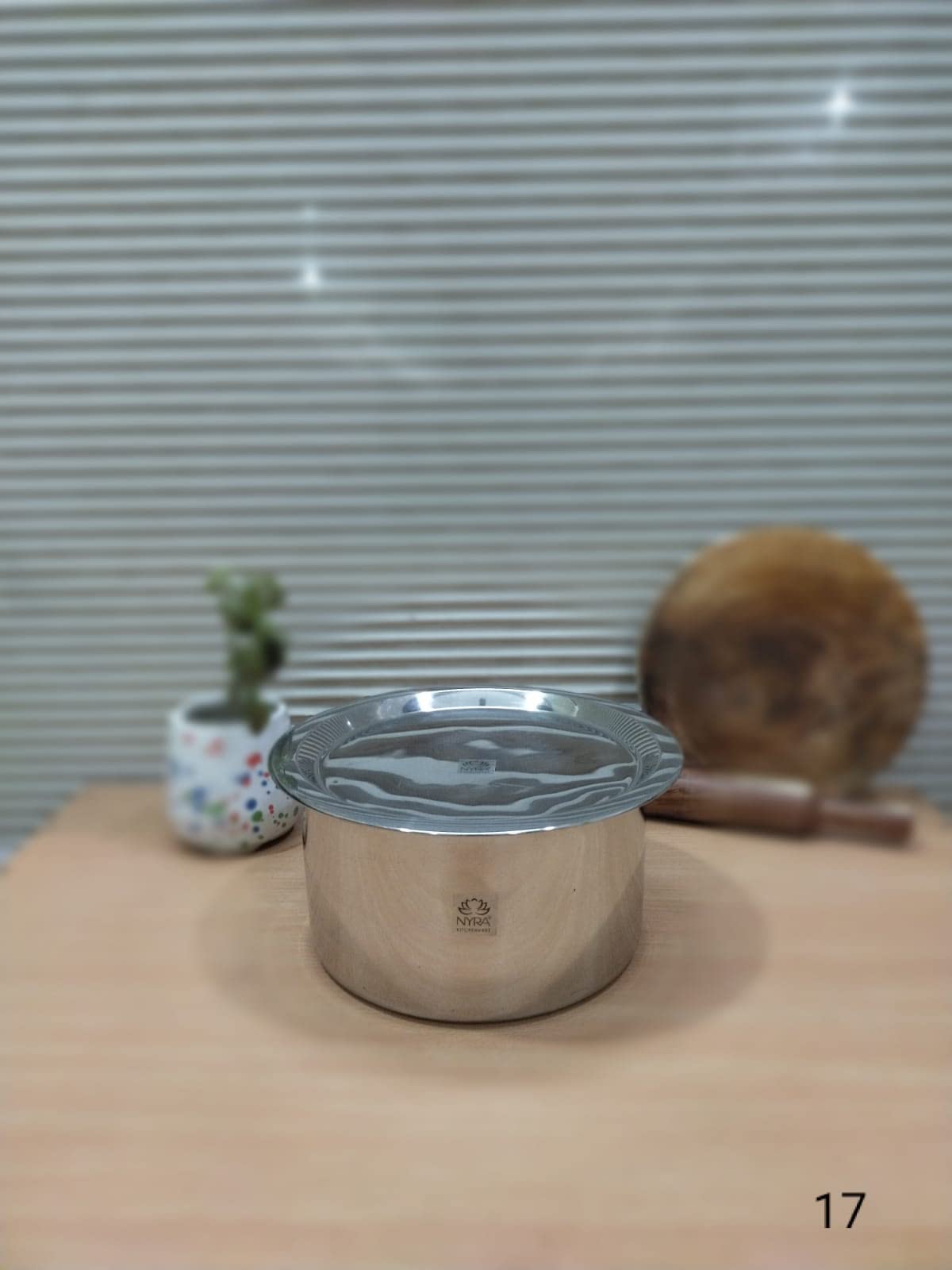 Nyra presents you a Stainless Steel Bhagona/Patila Flat Bottom Boiling Vessel with lid. The tope enables you to cook or boil different food items. Its flexibility to use and maintain is enhanced as it is a gas stove compatible; and can be easily cleaned in a dishwasher. Available in multiple sizes hence taking care of all your kitchen needs. This is ideal for stir-frying sautéing and even everyday cooking. Excellent for cooking curries and vegetable dishes. This tope is designed with flat bottom base that helps distribute heat evenly and quickly throughout the vessel and keeps the food in it warm for a longer duration. Long Side steel bards make it easy to hold it. It is easy to clean and maintain even with everyday usage. This cookware is dishwasher safe. Its seamless and sheen structure can be cleaned with ease. It is an essential cookware for modern kitchens as it is extremely versatile in its usage. The tope is compatible with induction as well as gas stoves.