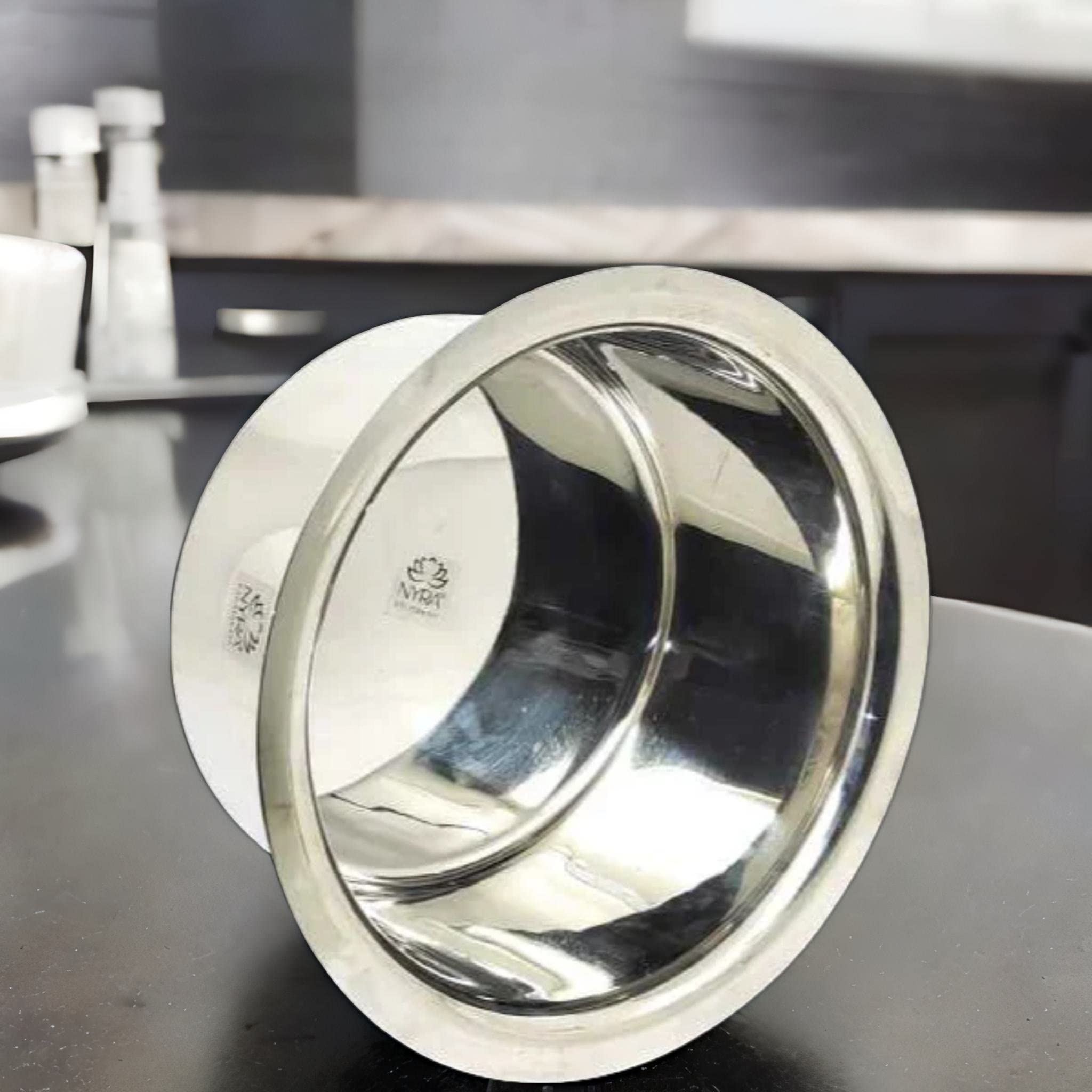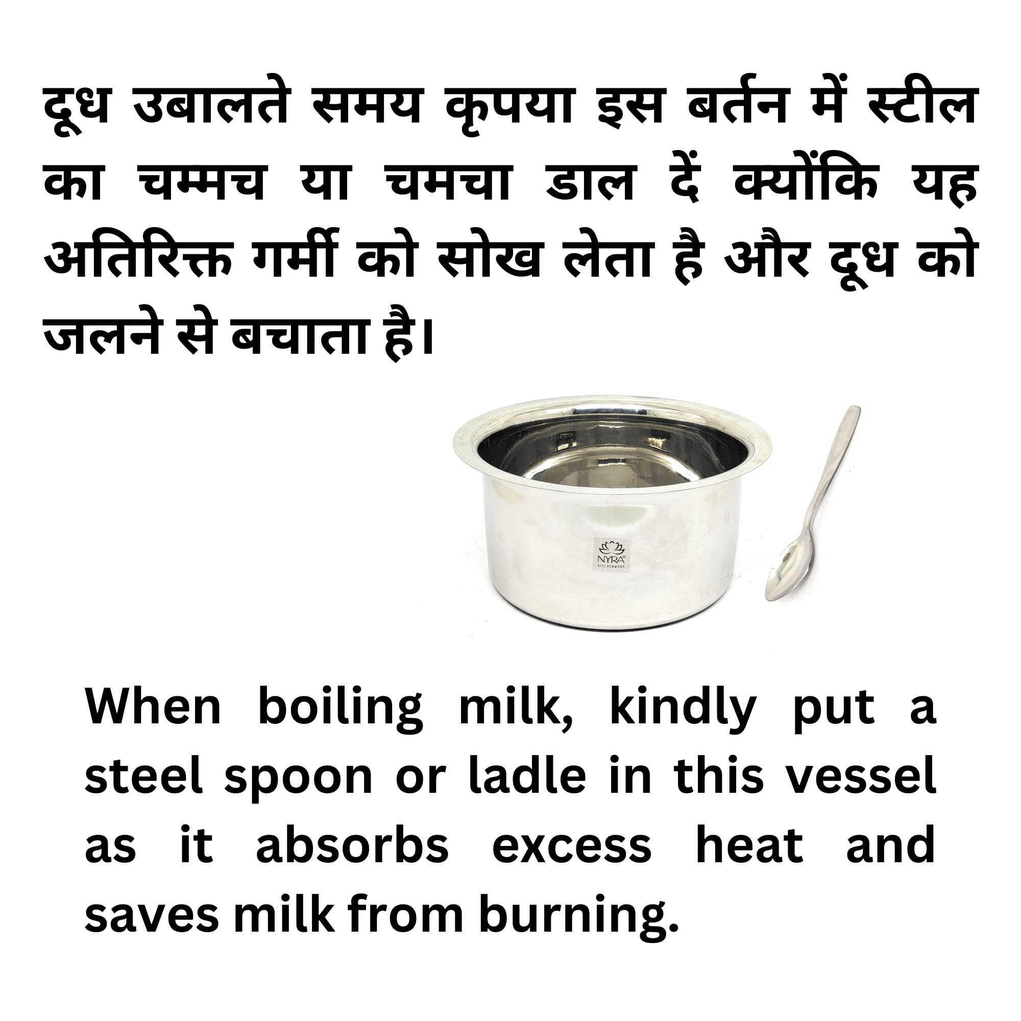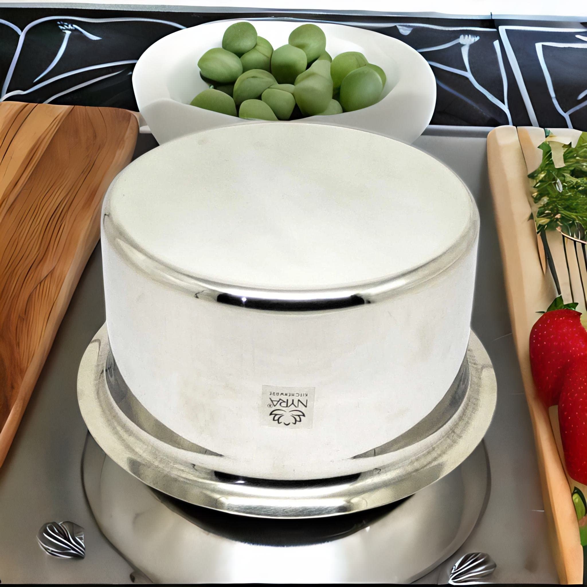 Nyra presents you a Stainless Steel Bhagona/Patila Flat Bottom Boiling Vessel with lid. The tope enables you to cook or boil different food items. Its flexibility to use and maintain is enhanced as it is a gas stove compatible; and can be easily cleaned in a dishwasher. Available in multiple sizes hence taking care of all your kitchen needs. This is ideal for stir-frying sautéing and even everyday cooking. Excellent for cooking curries and vegetable dishes. This tope is designed with flat bottom base that helps distribute heat evenly and quickly throughout the vessel and keeps the food in it warm for a longer duration. Long Side steel bards make it easy to hold it. It is easy to clean and maintain even with everyday usage. This cookware is dishwasher safe. Its seamless and sheen structure can be cleaned with ease. It is an essential cookware for modern kitchens as it is extremely versatile in its usage. The tope is compatible with induction as well as gas stoves.