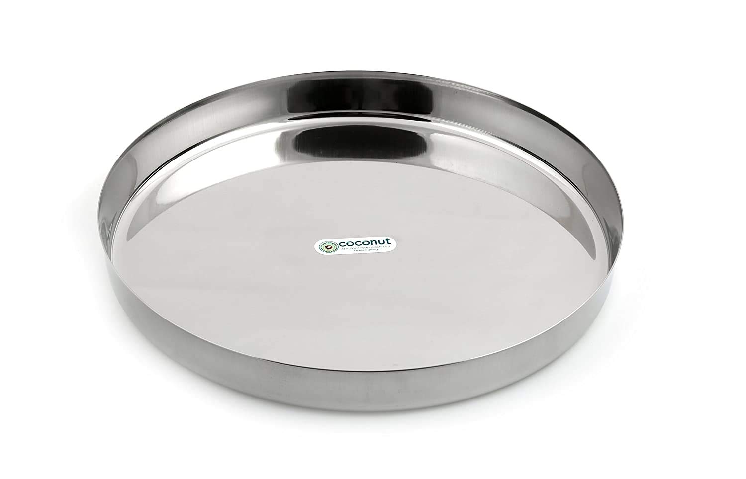 Coconut is a range of innovative and products from the house of BM agencies.This Thali is made from the finest of Stainless Steel It can easily be Handled and easy to cleanUnbreakable with Mirror Finish.It is an essential product for kitchenware collections. Product Content : Coconut Stainless Steel 21G Thali 9 Inch 1Unit Dimention Width 10 Inch Depth 1.5 Inch