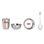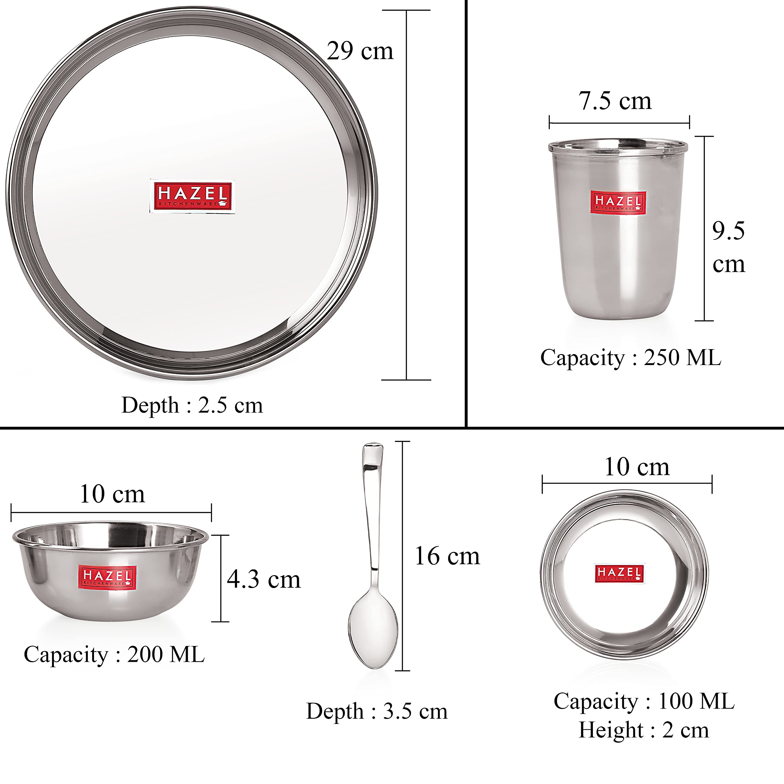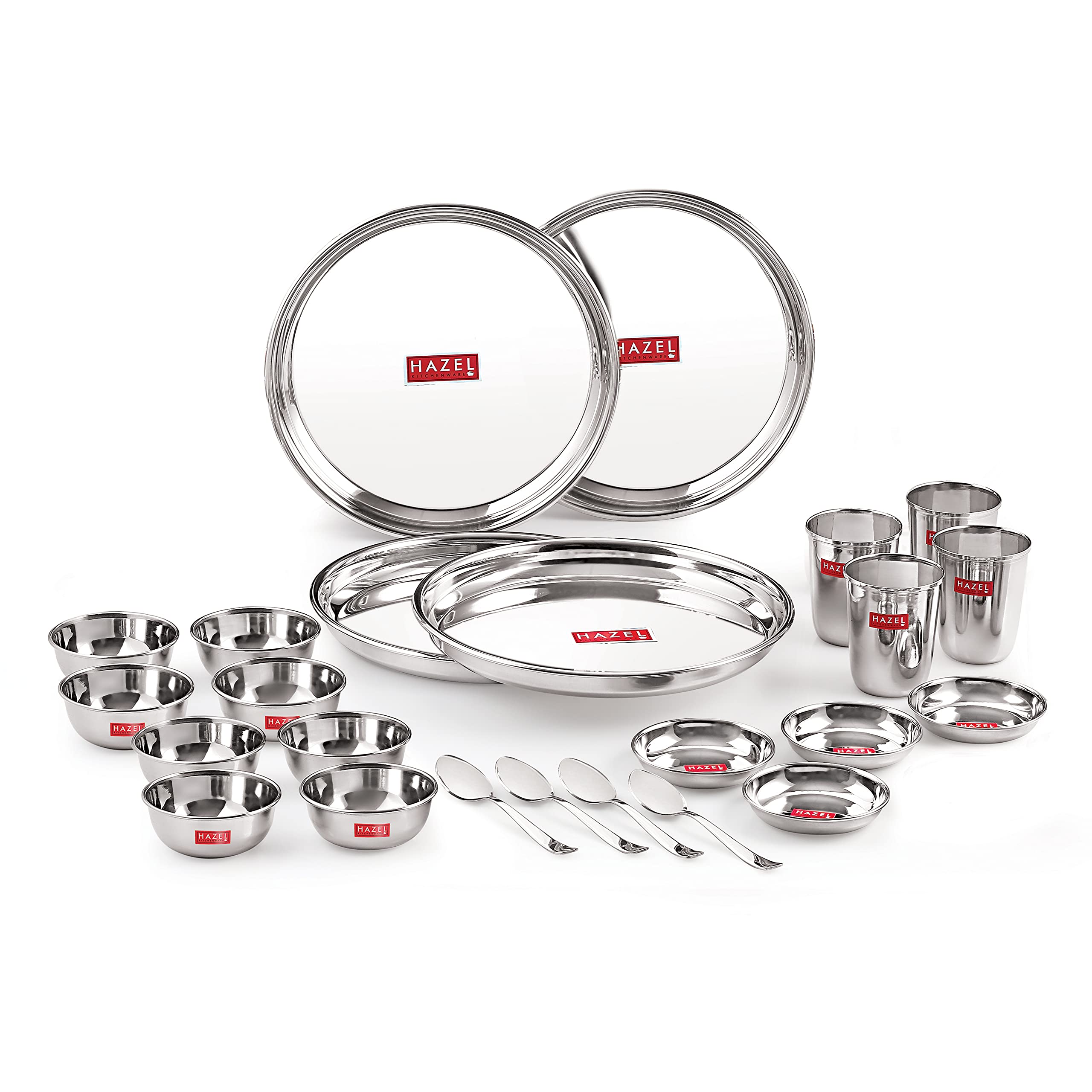24 pcs Stainless steel Dinner plate set (4 Steel Plate 4 Steel Glass 8 Bowl 4 Spoon 4 Dessert Plate). It is for multipurpose use for in home offices and restaurants. It is the basic plate which is required everywhere. This set is made from high quality stainless steel making it exclusive and durable. Stainless steel is hygienic to use and easy to clean as compared to other materials. An excellent choice if you are redoing your kitchen or want to replace your current dinner set with a trendy and contemporary one. Contemporary minimalistic design to suit your refined taste. Stainless steel is hygienic to use and easy to clean as compared to other materials. This set can be nested one into another and therefore helping save shelf space in the kitchen This set is perfect for gifting purposes at weddings anniversaries. You get a magnificent dinner set at an extremely affordable price.